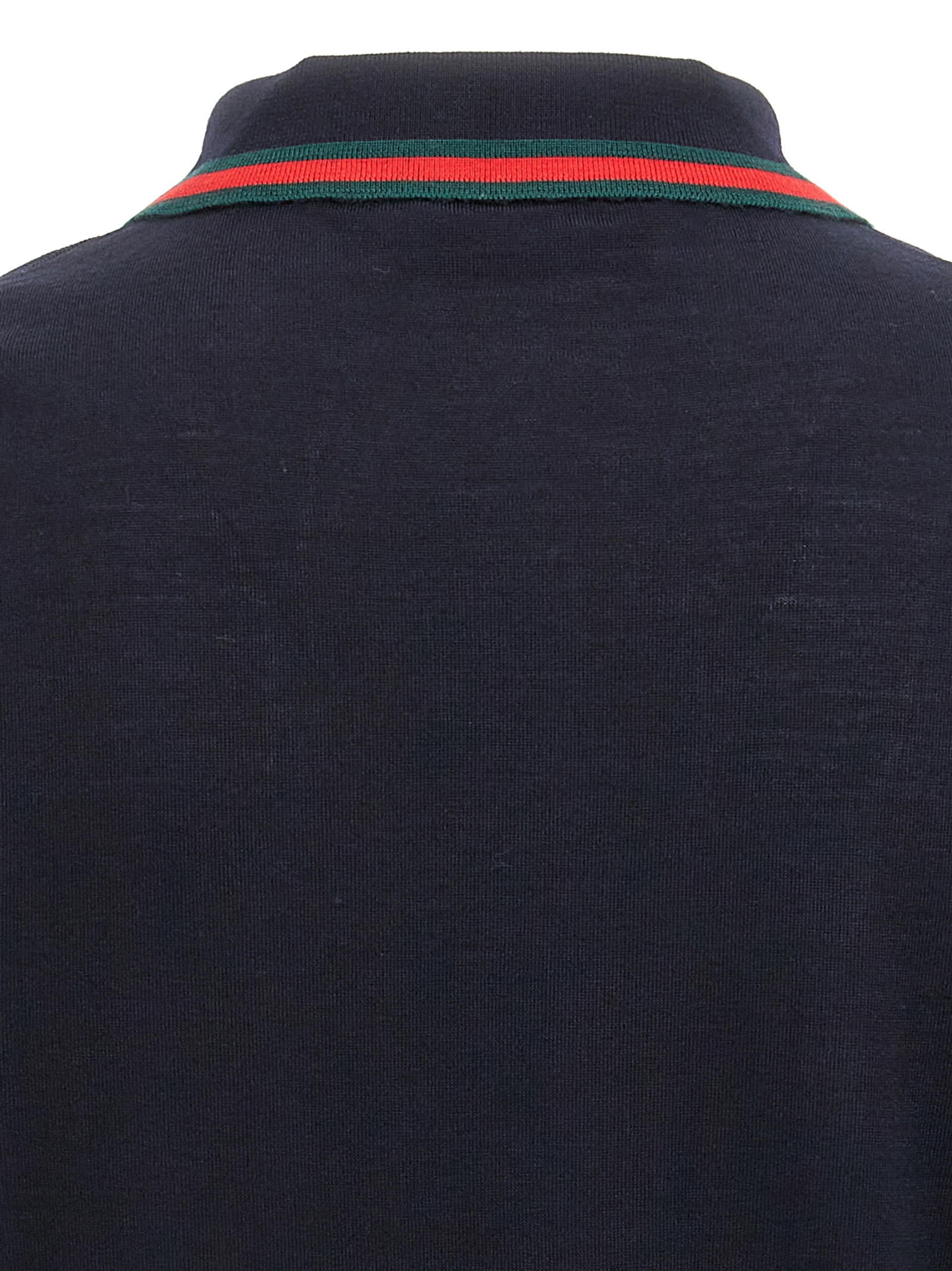 Fine knitted wool polo shirt, collar with Web ribbon detail and buttons, short sleeves.