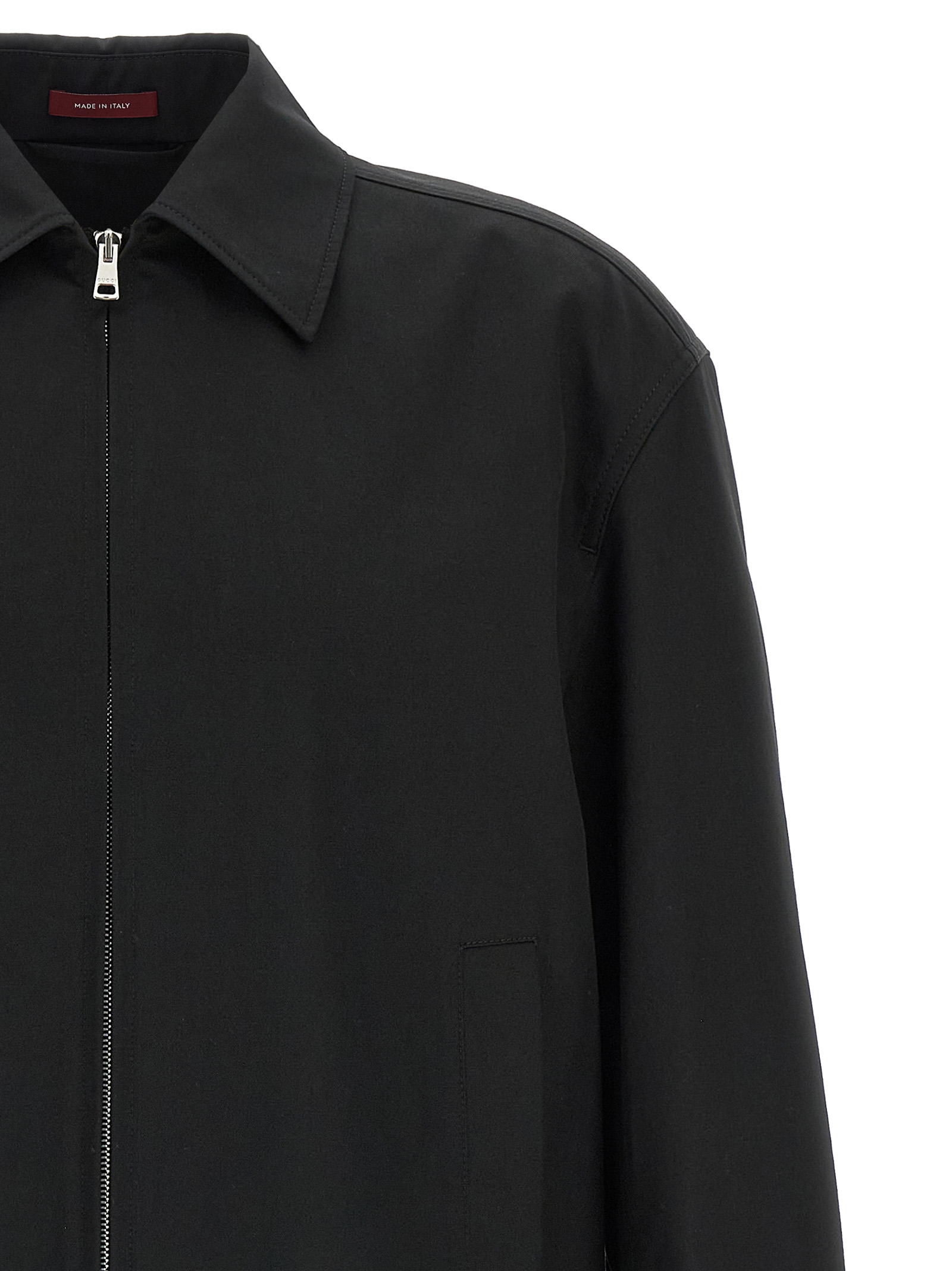 Specco cotton jacket with button closure, shirt collar, pockets, back web ribbon detail, long cuffed sleeves.