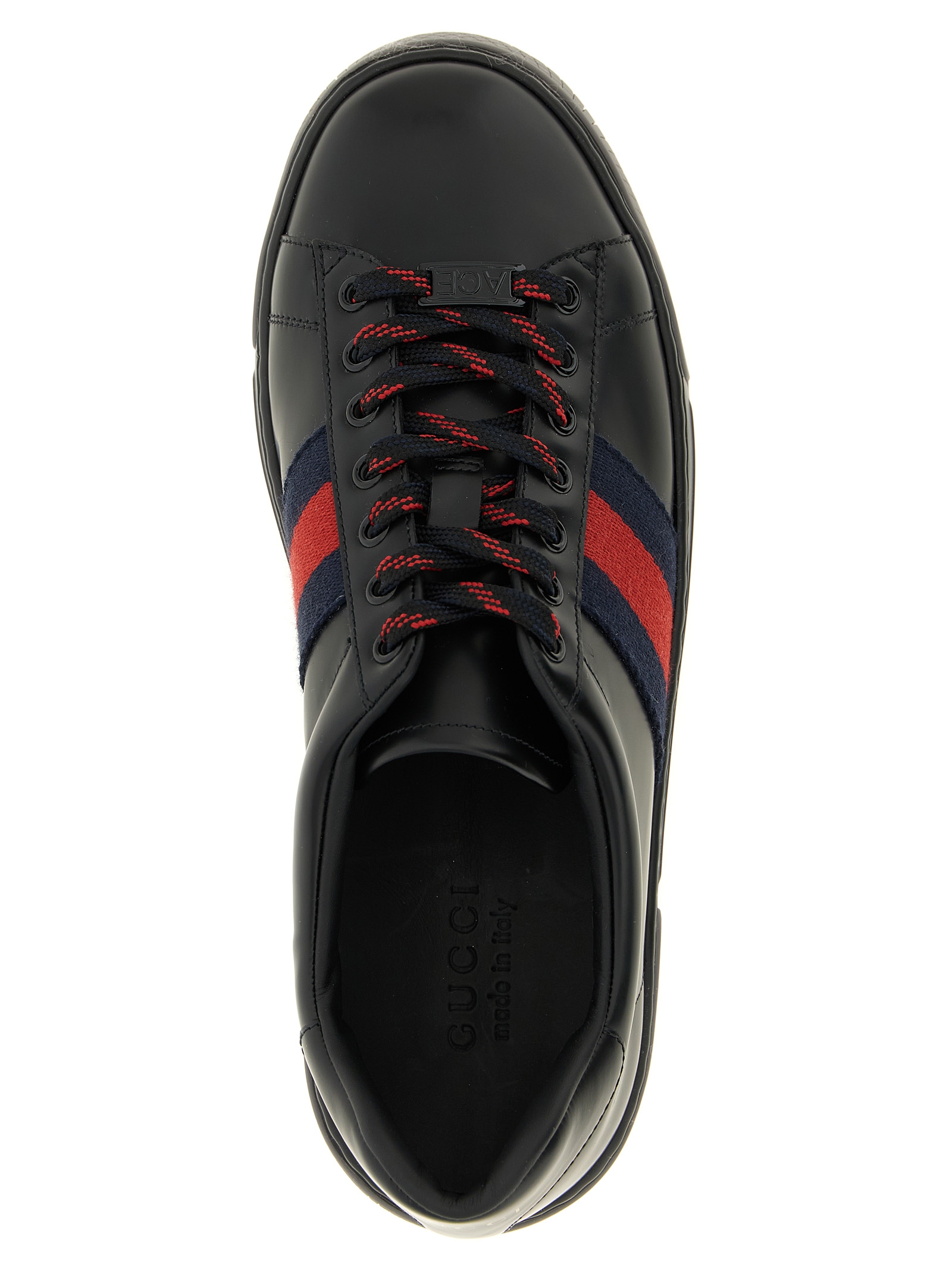'Gucci Ace' sneakers in shiny smooth leather, lace closure with removable metal 'Ace' tag, side Web ribbon, back embossed logo, two-tone rubber sole.
