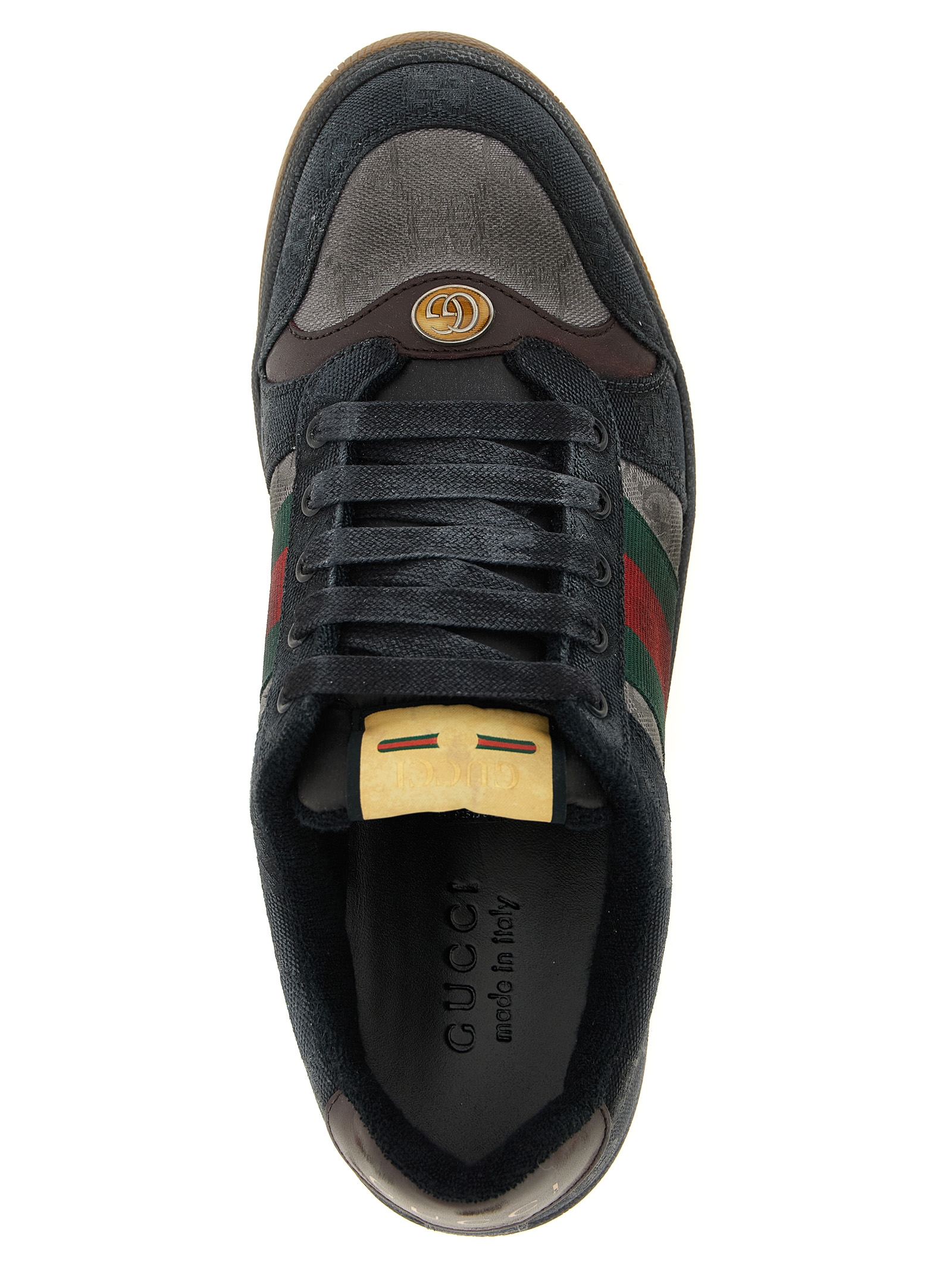 'Screener' sneakers in two-tone GG fabric with délavé effect and contrasting smooth leather, side Web ribbon, vintage Gucci logo tongue, enamelled oval detail with double G in metal on the front, laces, rubber sole.