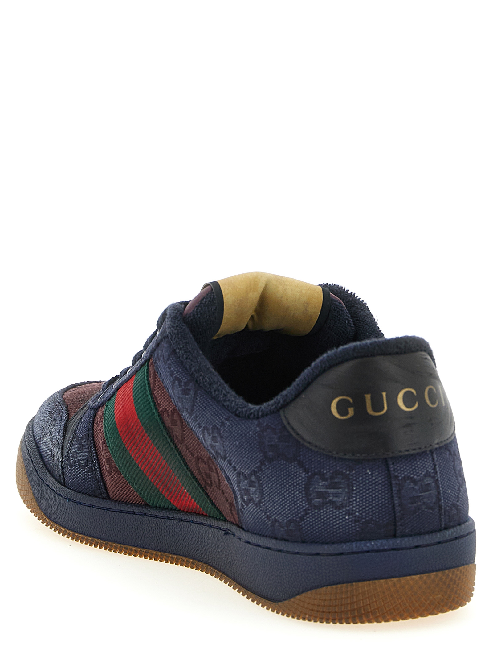 'Screener' sneakers in two-tone GG fabric with délavé effect and contrasting smooth leather, side Web ribbon, vintage Gucci logo tongue, enamelled oval detail with double G in metal on the front, laces, rubber sole.