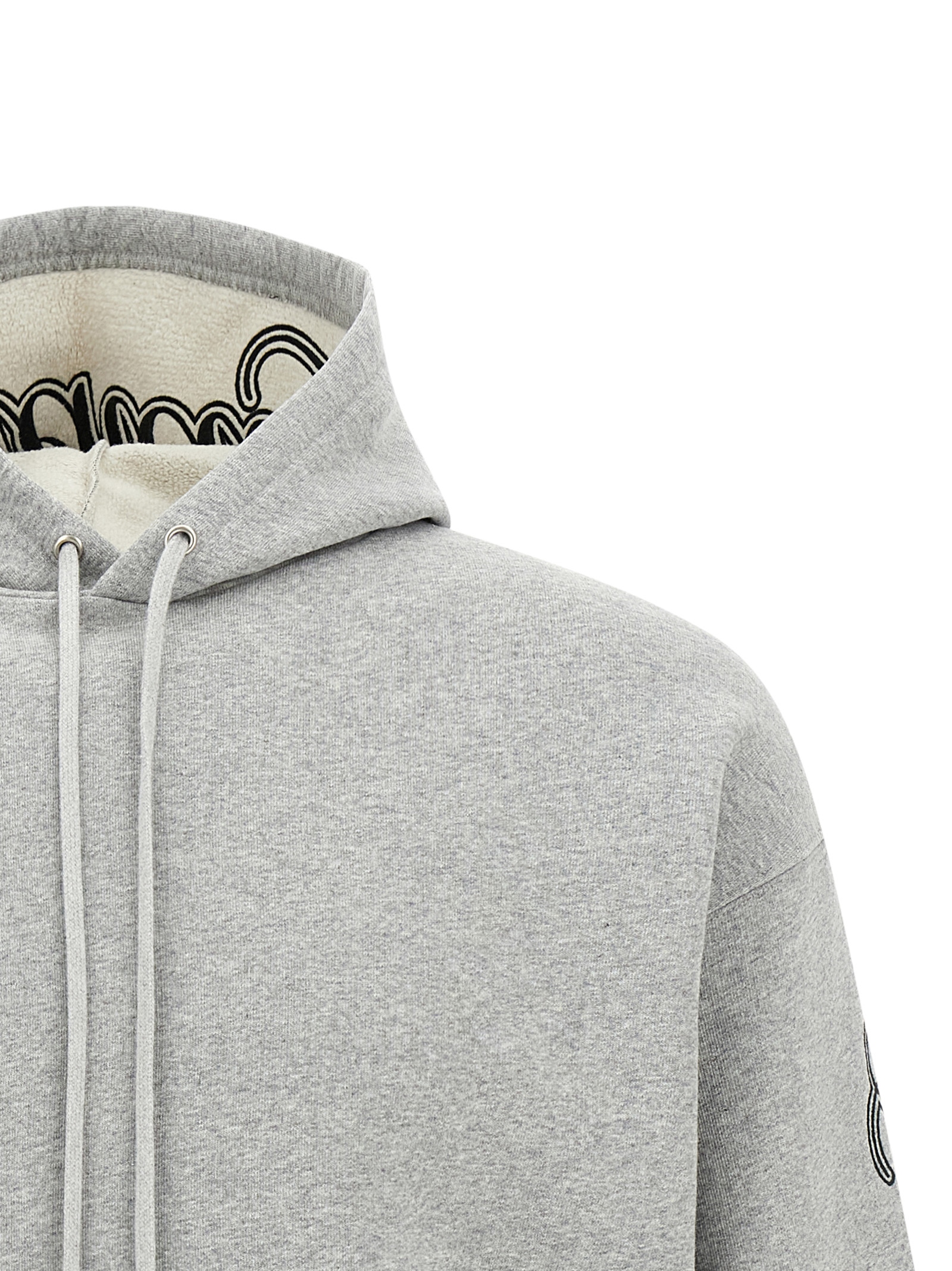 Dry mélange fleece hoodie with 'Cursive' embroidery, kangaroo pocket, long sleeves with cuffs and dropped shoulders, and headband.