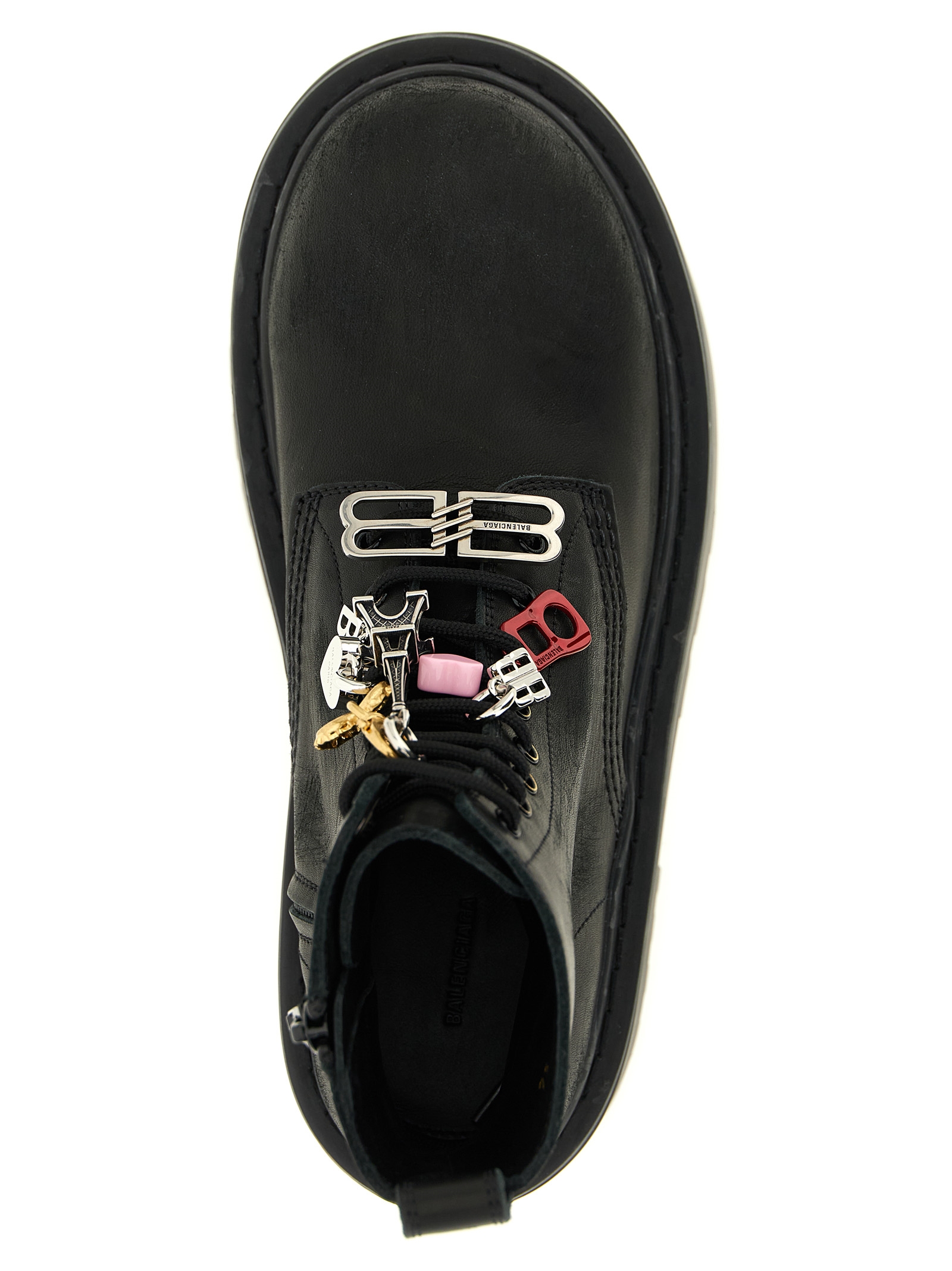 'Strike' ankle boots in soft used-effect bull leather, amphibious model, rounded toe, laces closure with multicolor and multimaterial removable charms, side zip, serrated rubber platform sole.