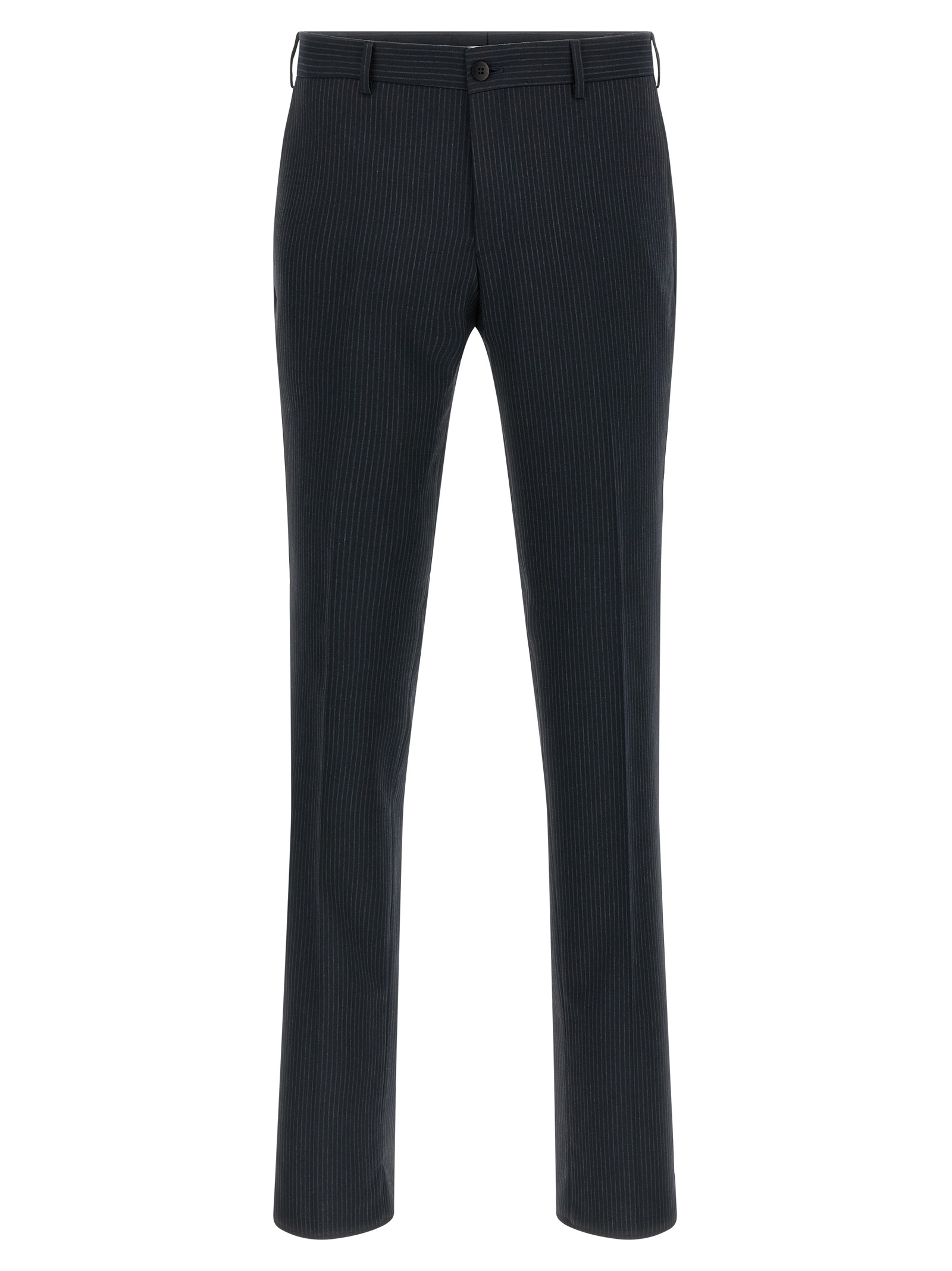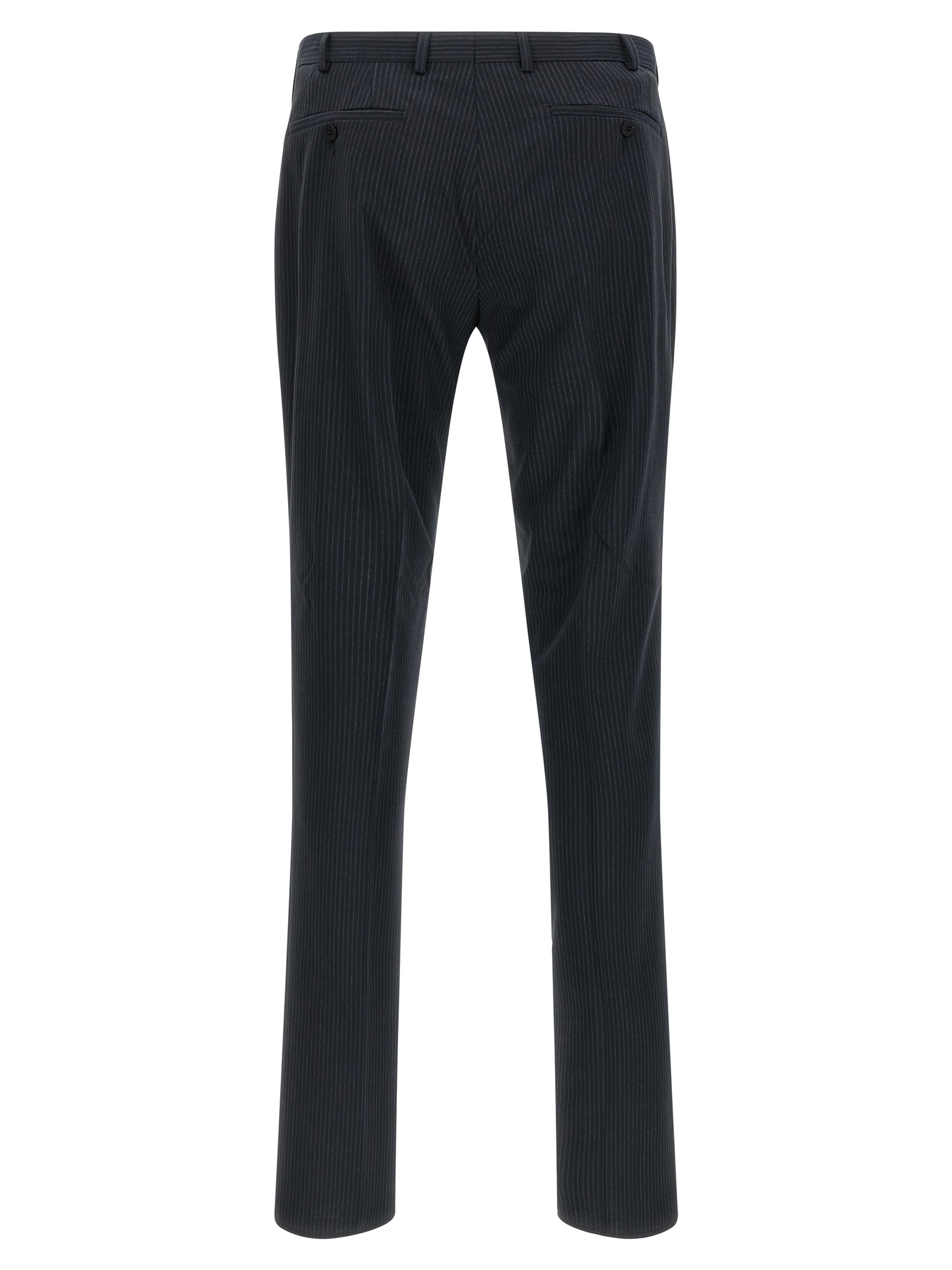 'Lord' dress in viscose blend and wool with pinstriped pattern consisting of single-breasted blazer with front button closure, mirror lapels with removable metal brooch, breast pocket, flap pockets, cupro lining, two inner pockets, structured shoulder strap, cuffs with opening buttonholes, back slits and trousers with stretched pleat, front pockets 'americane', back welt pockets, front zip and button closure, viscose lining.