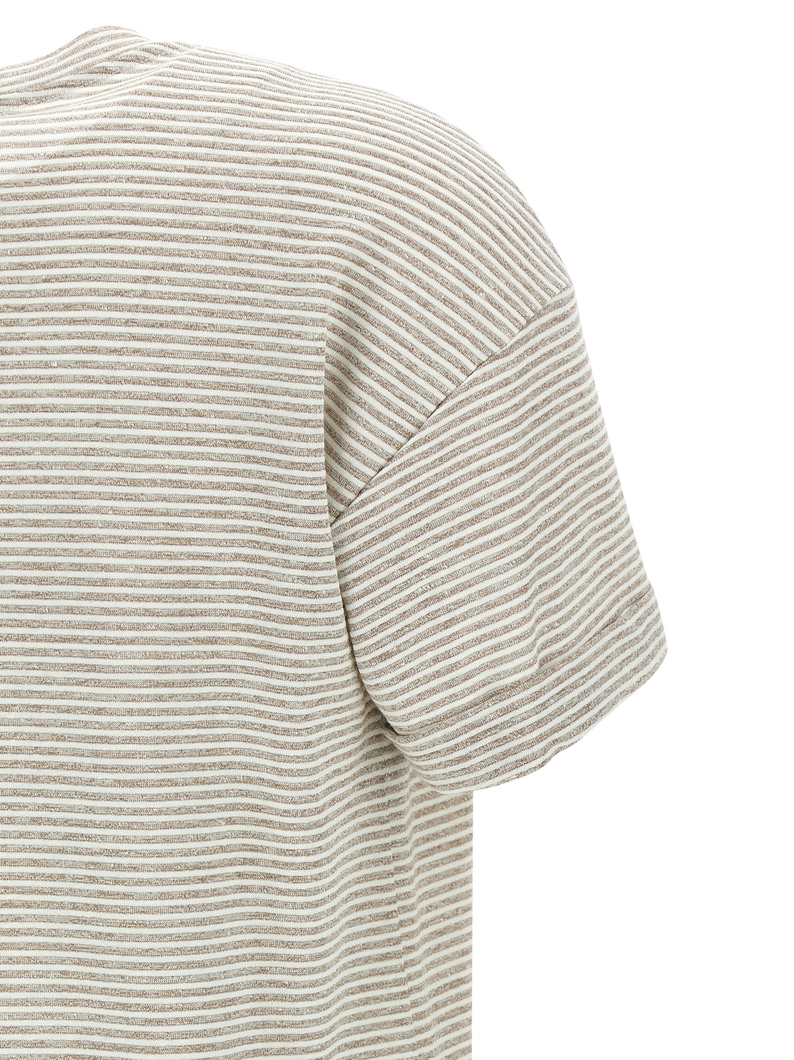 Striped linen and cotton blend T-shirt with lamé thread, crew neck, short sleeves with dropped shoulders and turn-up on the cuffs.