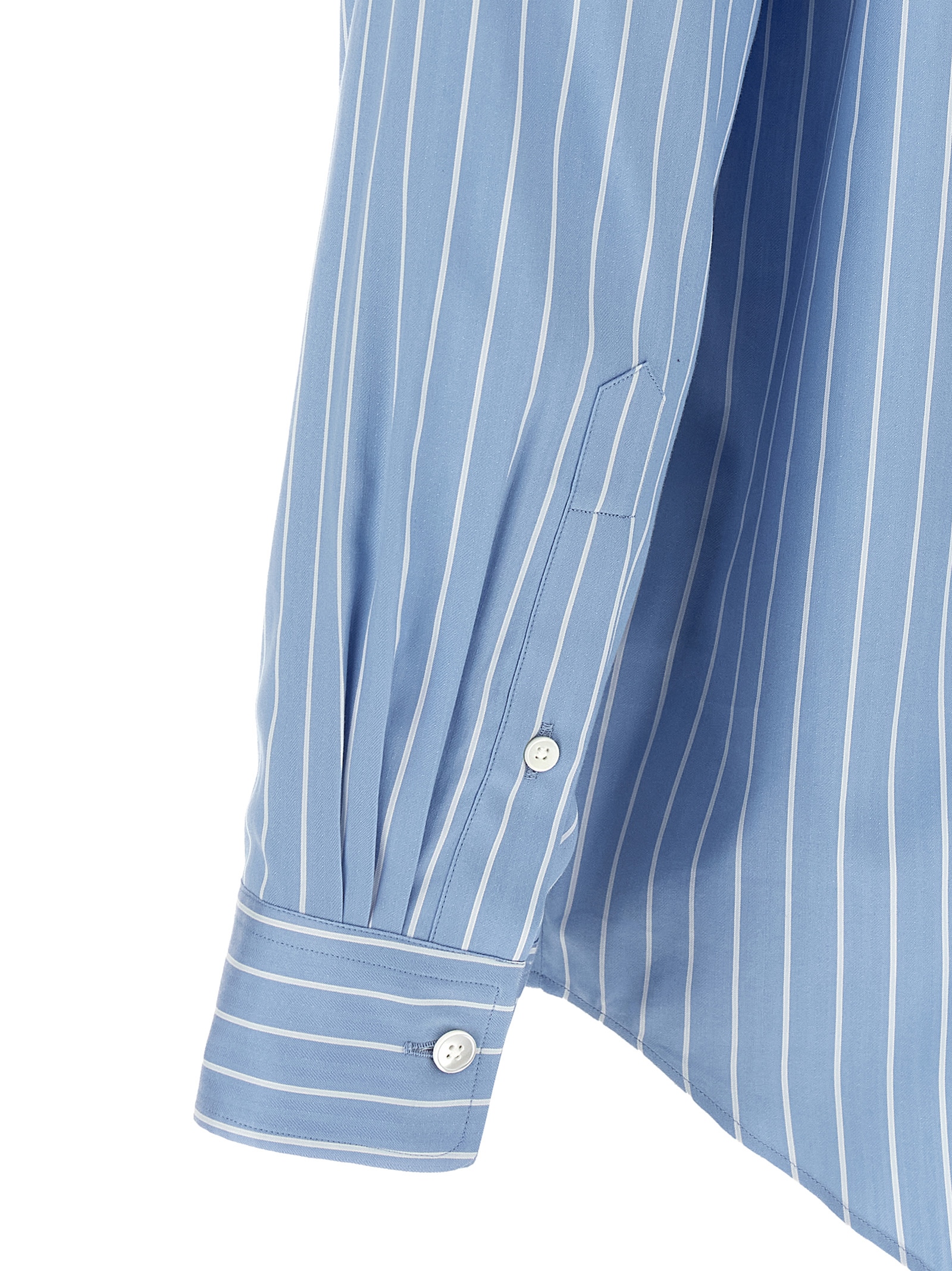 Striped cotton and silk shirt, high-density fabric with extra-long Giza cotton finely spun, pointed collar, front mother-of-pearl button closure, long cuffed sleeves, rounded and asymmetrical hem.