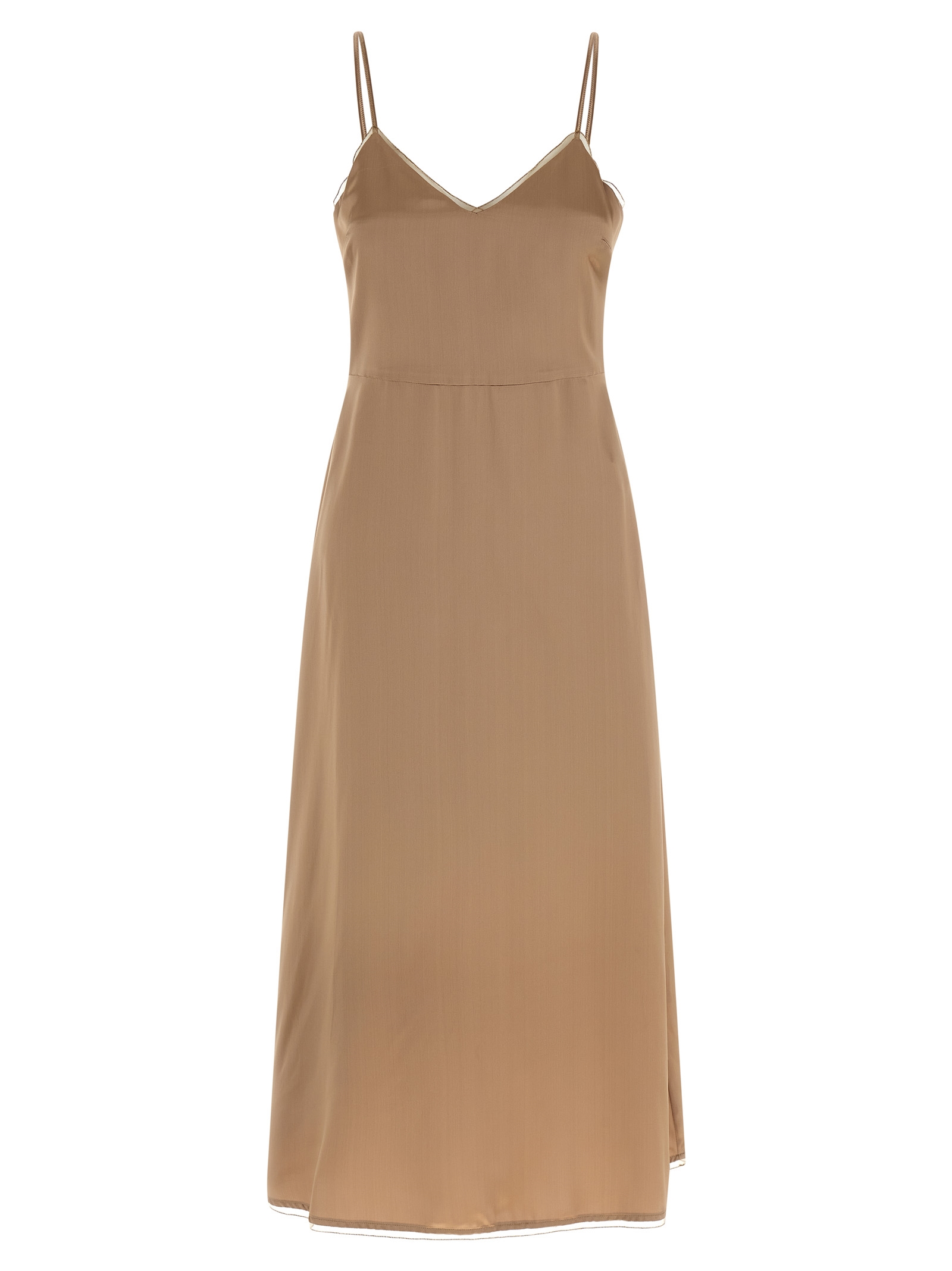 Liquid satin midi dress with lingerie, sweetheart neckline, thin straps, hourglass silhouette, back zip closure, matching cape with boat neckline and removable 3/4 wide sleeves.