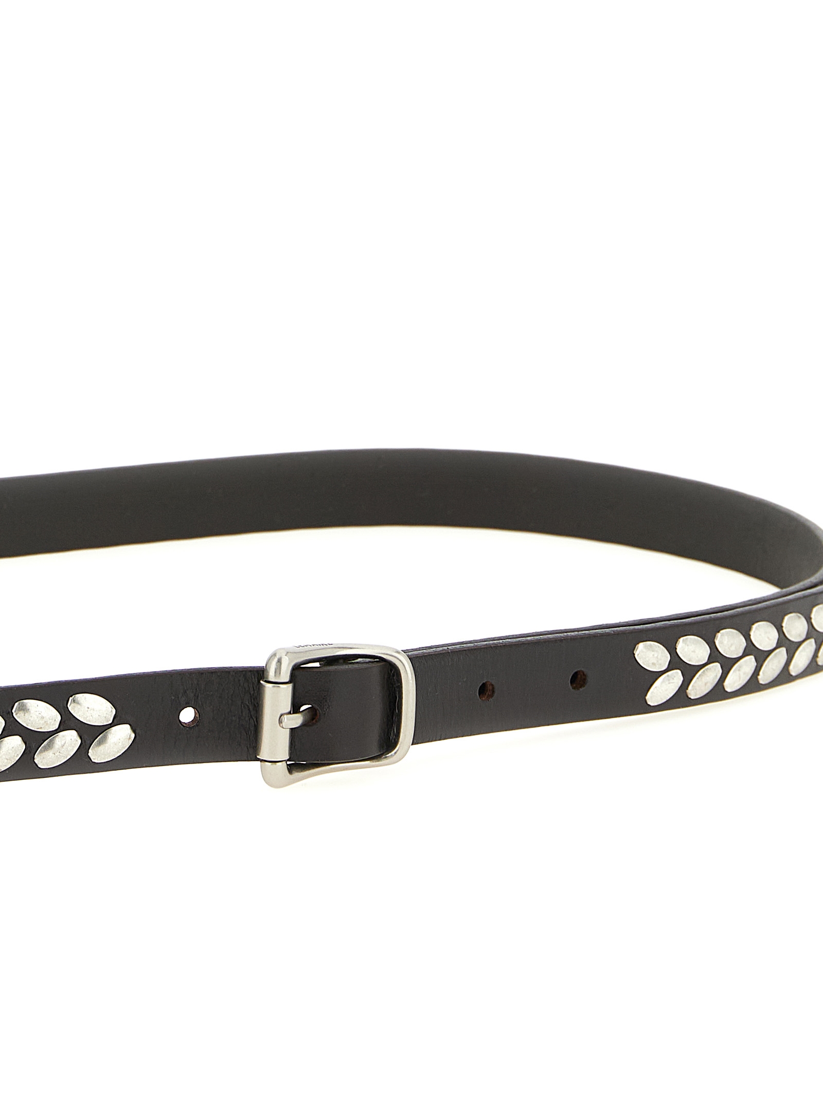 Vegetable-tanned leather belt with metal 'Almond Stud' appliqués, curved metal buckle.