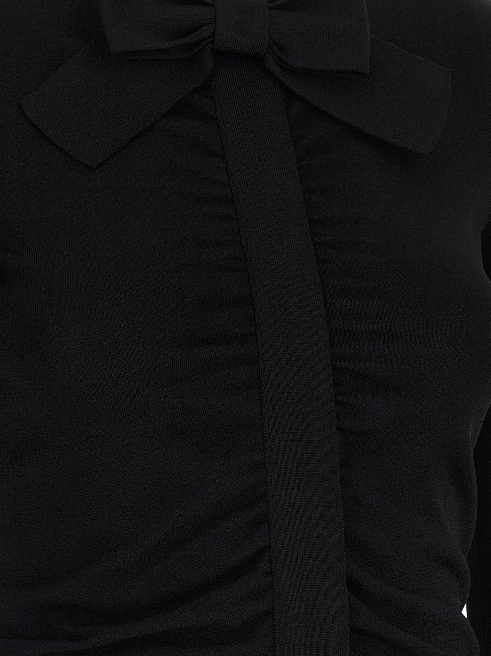 Stretch viscose cardigan with crewneck with tone-on-tone maxi bow and concealed zip closure with ruffles along the front zip, long cuffed sleeves, and headband.
