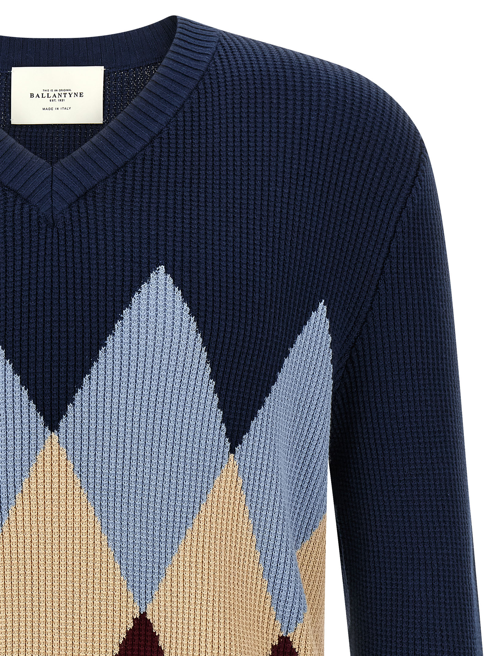 Waffle stitch cotton sweater with front Argyle jacquard pattern, V-neck, long cuffed sleeves.