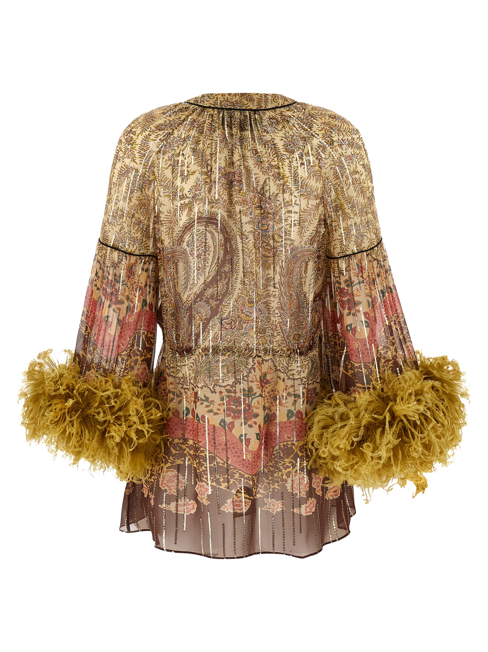Pekin 'Voyage Imaginaire Paisley' print silk top with lamé thread, drawstring with tassels to tie around the neck and waist, flared long sleeves with dropped shoulders and ruffled feather boa on the sleeve hem.