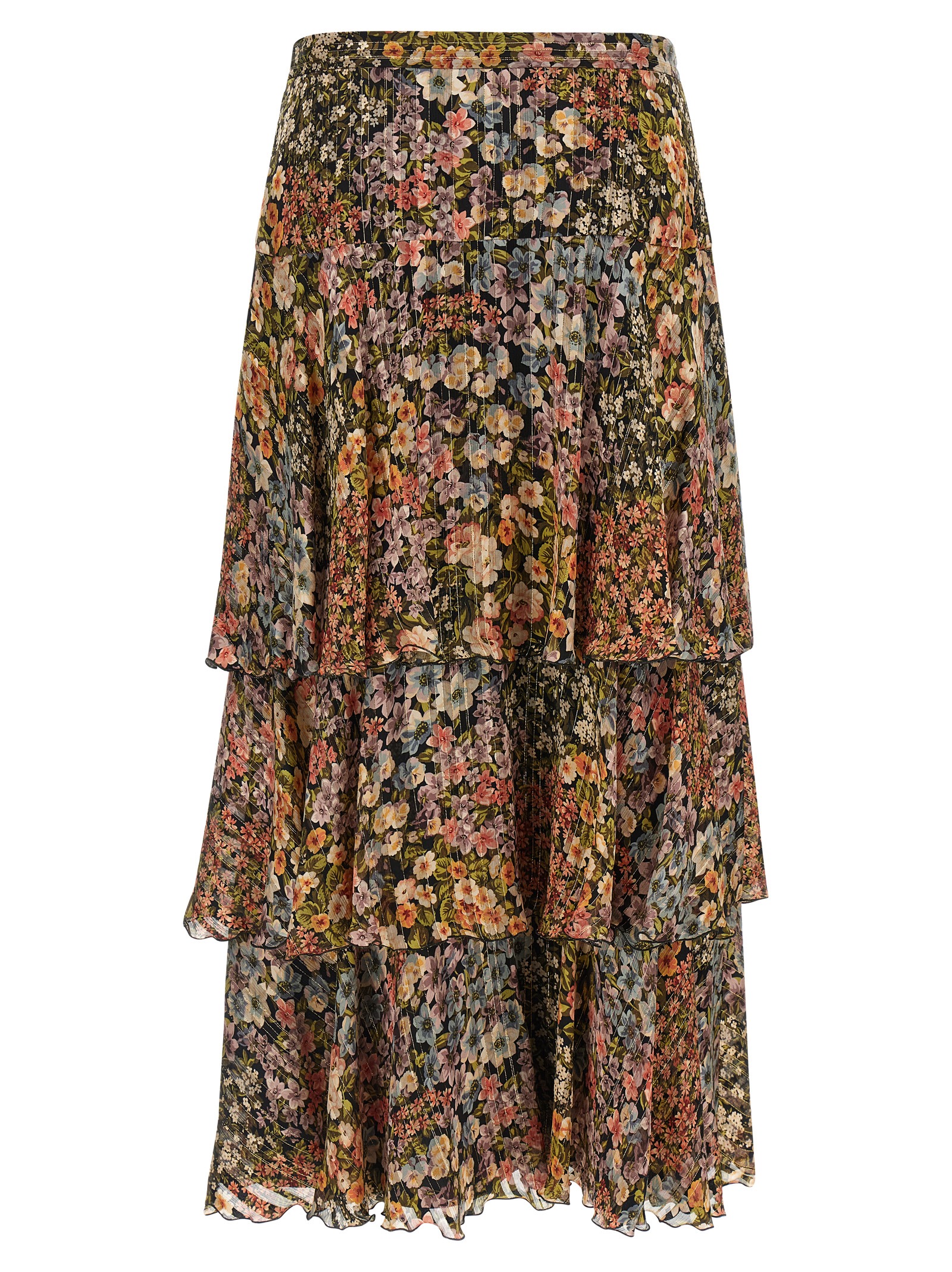 Midi skirt in semi-transparent silk with all-over 'Après l'hiver - Fiorellini' print with lamé thread, ruffled flounce construction, side zip closure, asymmetrical hem, lining.