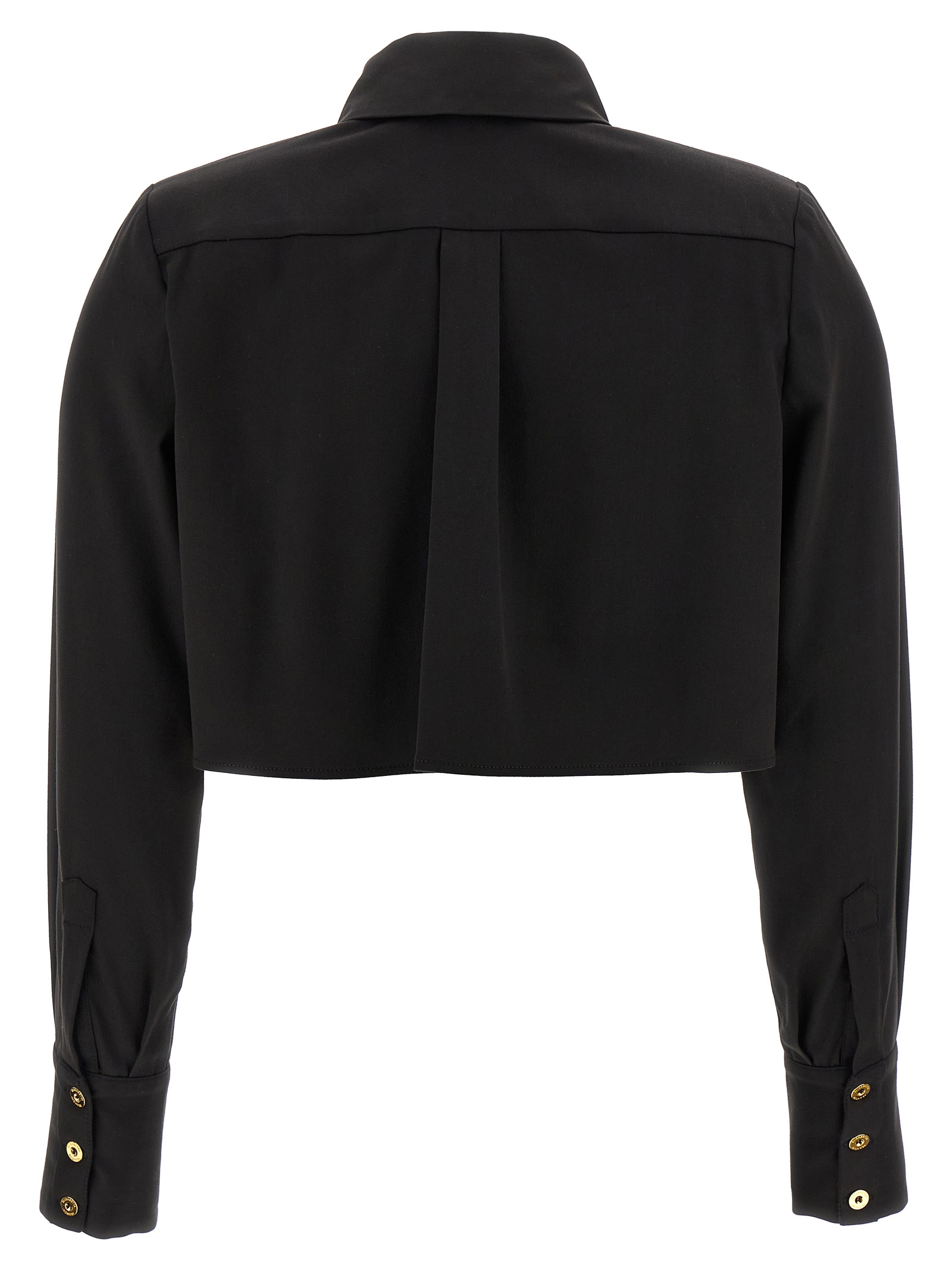 Cropped cotton satin shirt, front button closure, padded shoulders, and long cuffed sleeves.