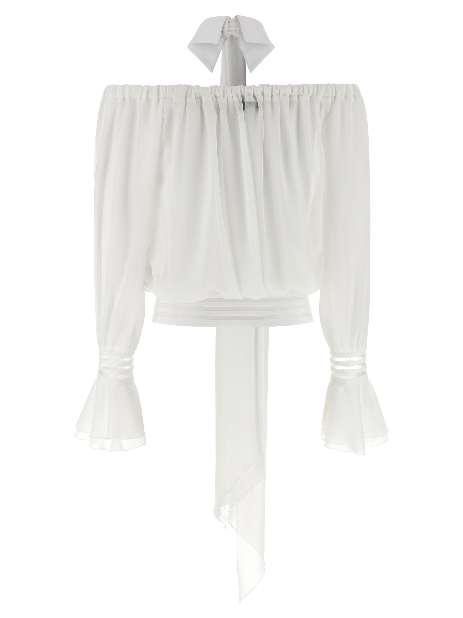 Off-the-shoulder semi-transparent fabric blouse with upper elastic band, tonal fabric shirt collar with front jewel button and removable sash fabric, crop model, long sleeves with cuffs, ruffle sleeves, elastic band on the hem.