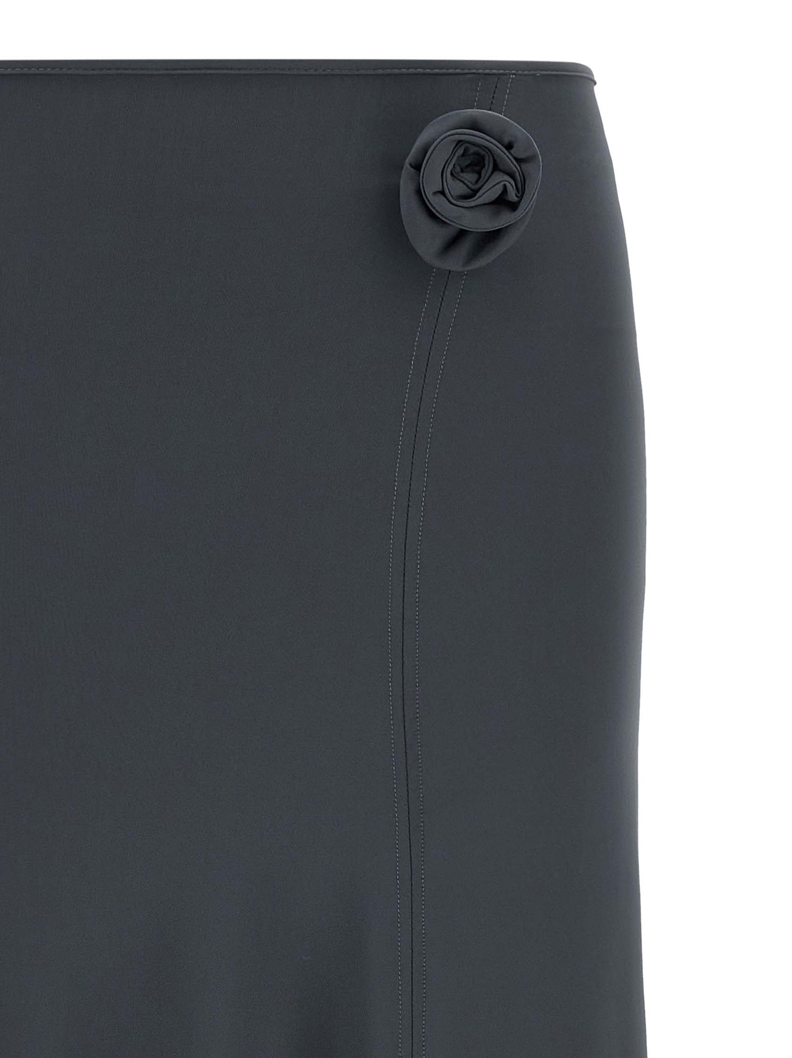 'Flower' midi skirt in stretch technical fabric with flared silhouette, floral bow detail and front slits, asymmetrical hem.