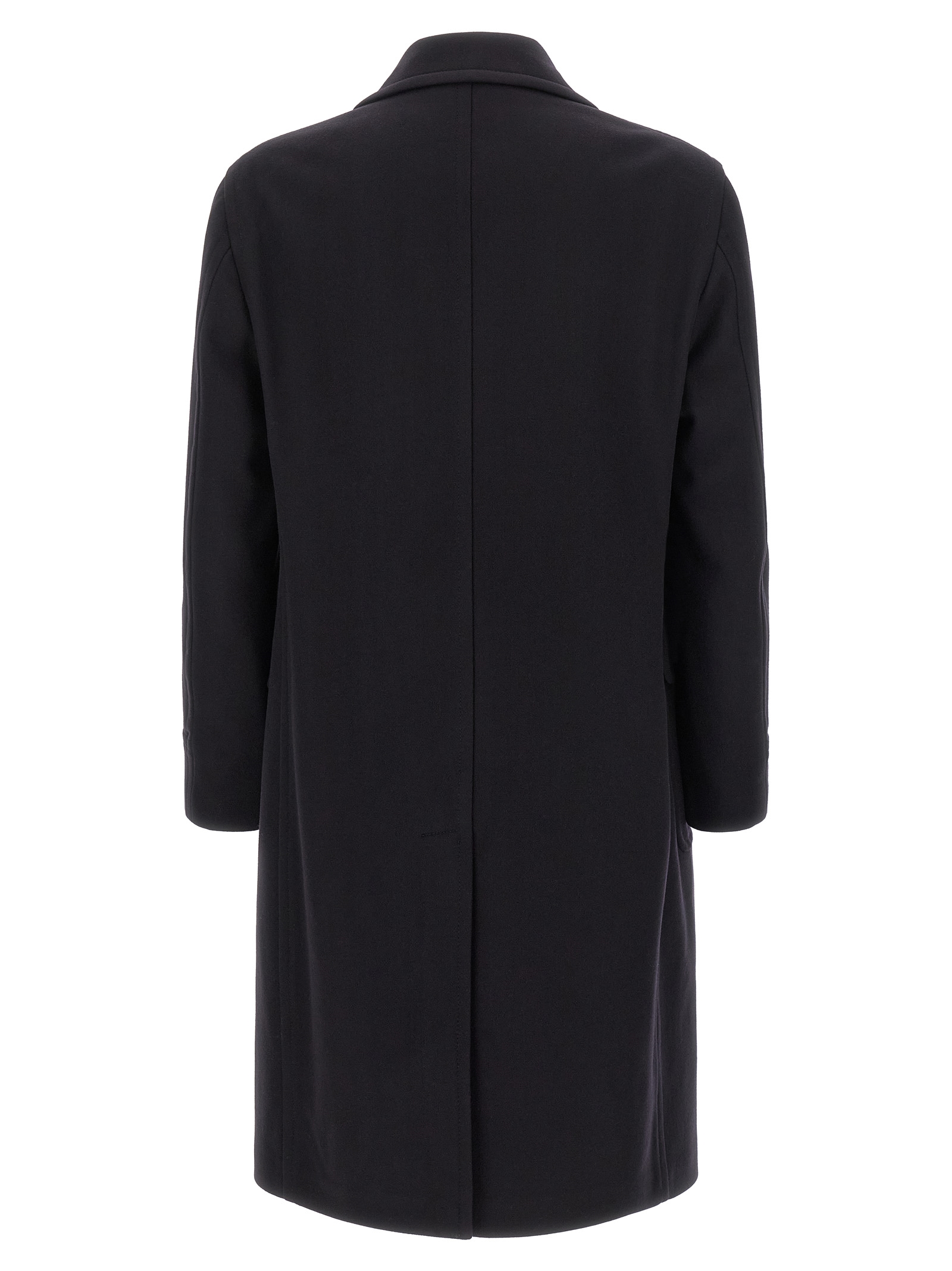 Double-breasted 'Sherry' wool and cashmere blend midi coat with front horn button closure, collar with back leather insert, mirror lapels with removable metal brooch, pockets, long sleeves, structured shoulder, back split, half cupro monogram lining, two inner pockets. The garments of the 'Pino Lerario' line use fabrics created exclusively for Tagliatore.