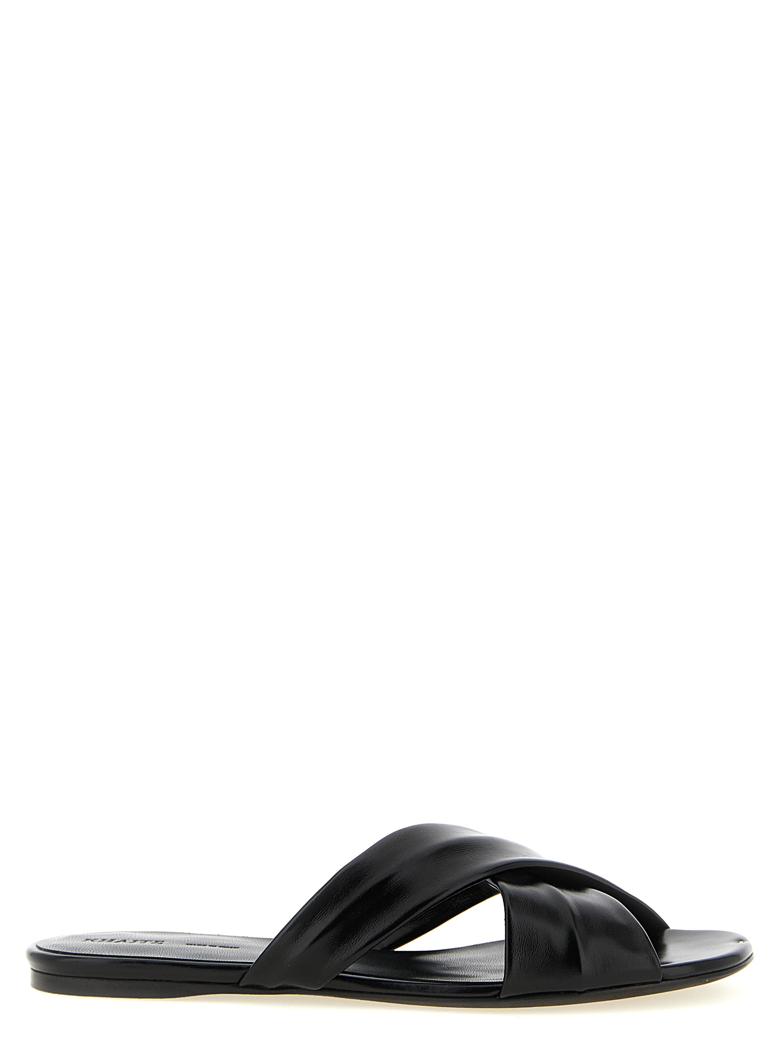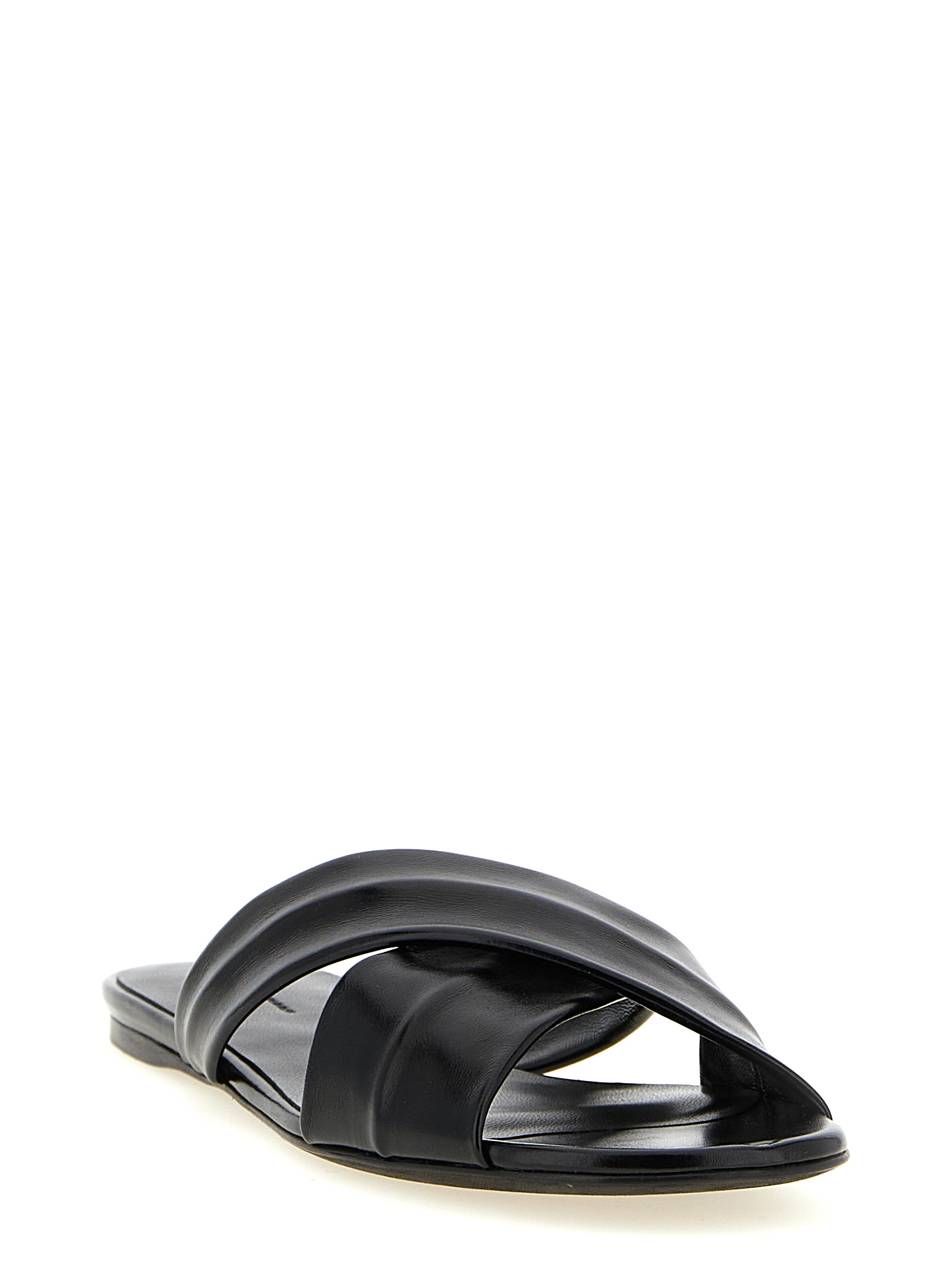 'Liria' sandals in polished Italian calf leather with wide crossed straps, front metal detail, padded and flexible footbed, leather sole.