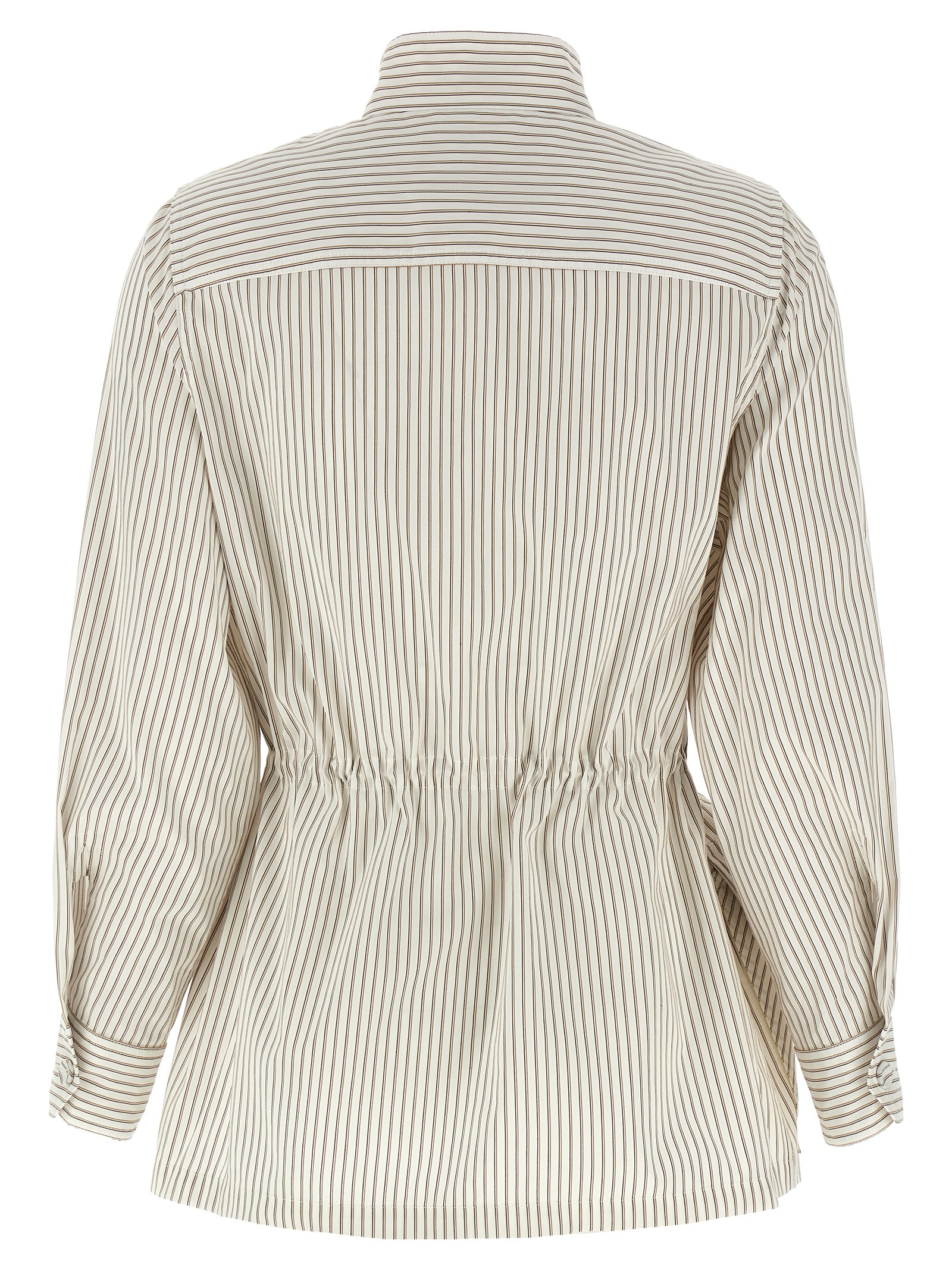 Cotton and silk blouson with all-over contrasting printed striped pinstripe pattern, mandarin collar, pockets, front zip and snap button closure, long cuffed sleeves, back elastic waistband with front belt, front logo embroidery.