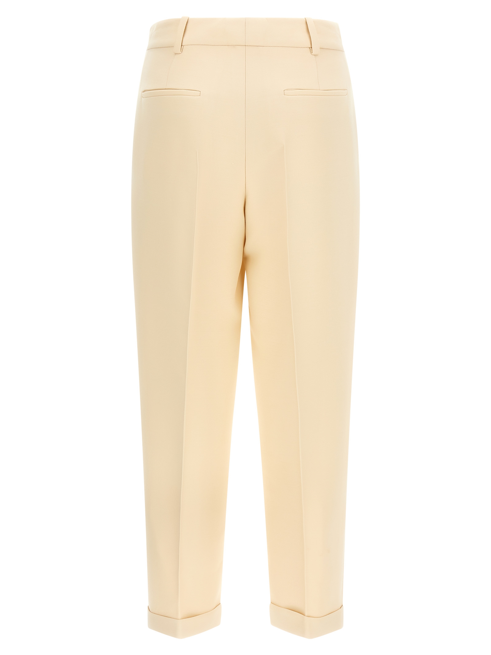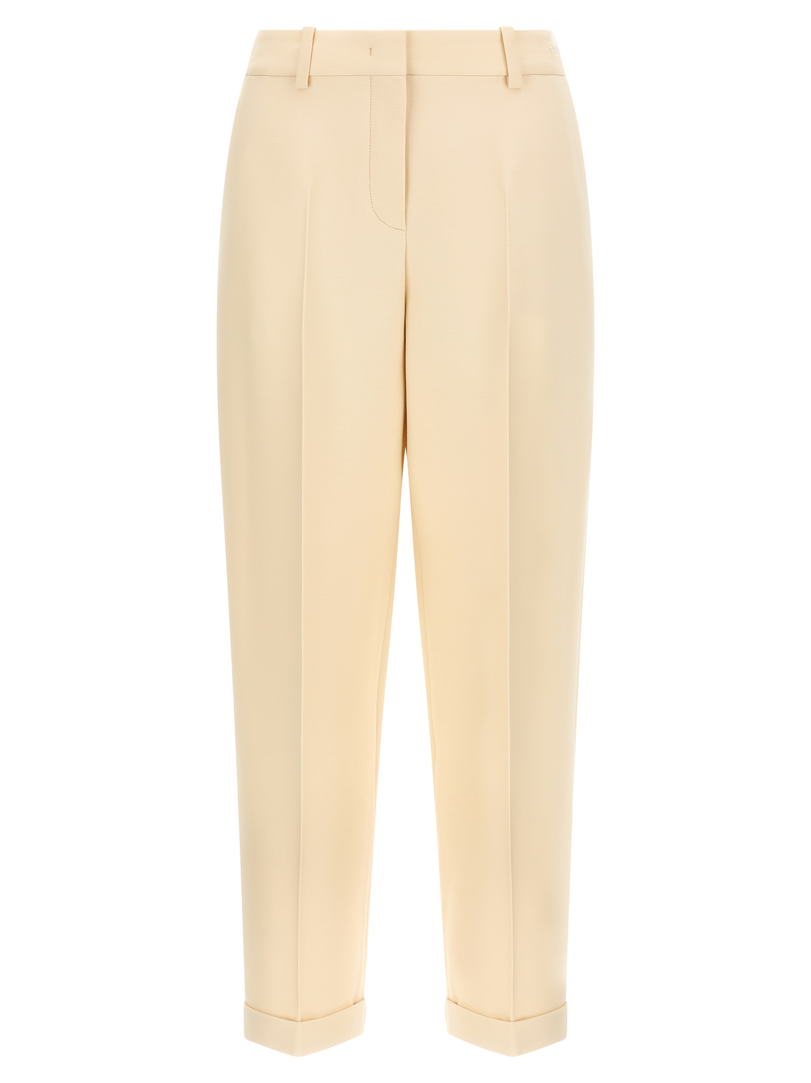 Wool and silk blend trousers, tone-on-tone embroidered logo at the waist, ironed pleat, zipper hook and button closure on the front, pockets, turn-up on the leg bottom.