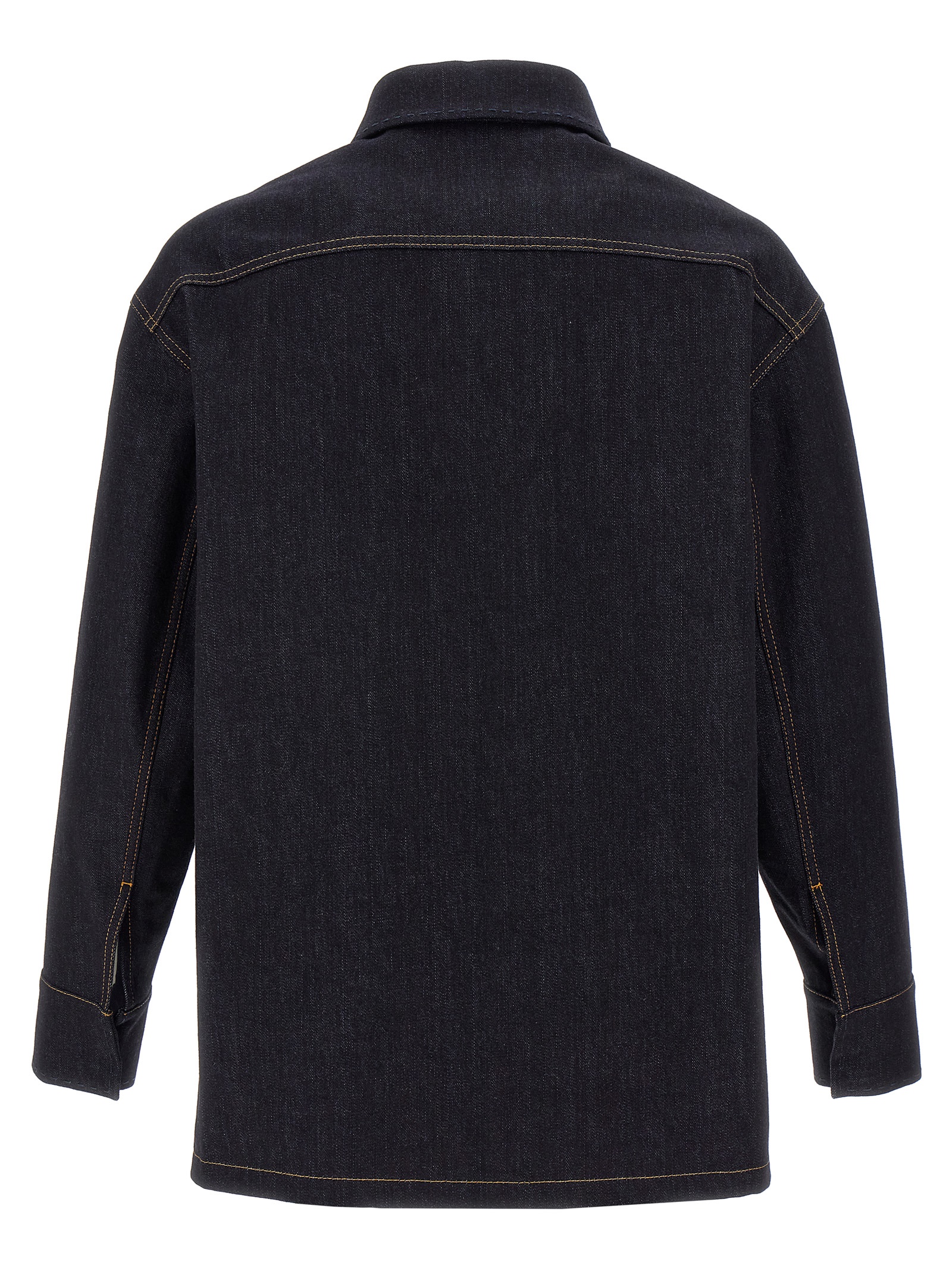 Denim fabric jacket, FF logo embroidery on the front pocket, straight design, tone-on-tone saddle stitching and contrast stitching, shirt collar, front snap button closure, pockets, long sleeves with cuffs and dropped shoulder.