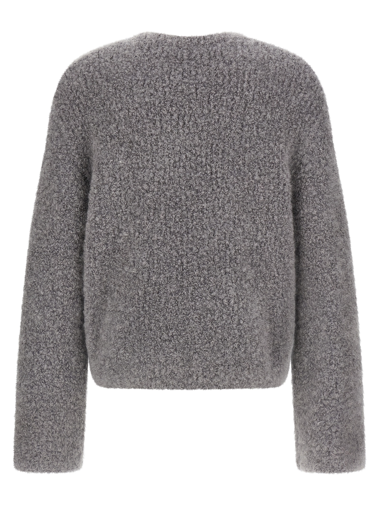 'Jermaine' sweater in bouclé mohair blend yarn, boat neck, long sleeves with dropped shoulders.