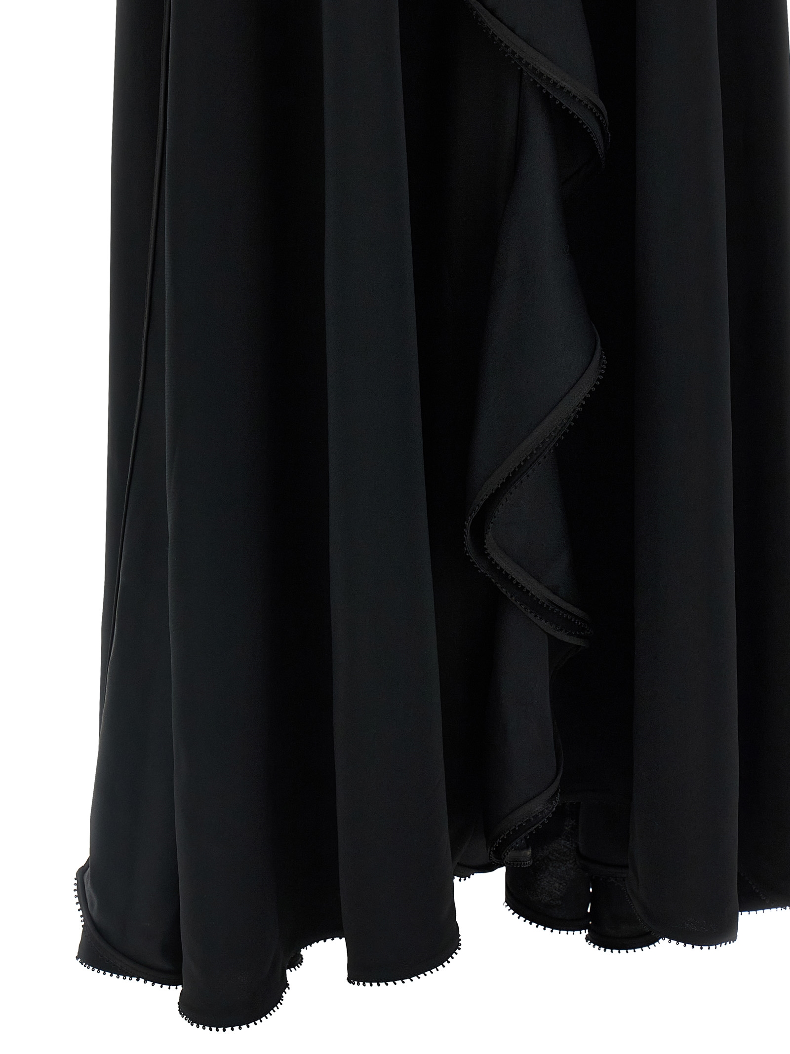 Long dress, V-neck, front metal application detail, front ruffles, wide side slits on the length, side zip closure, sleeveless.