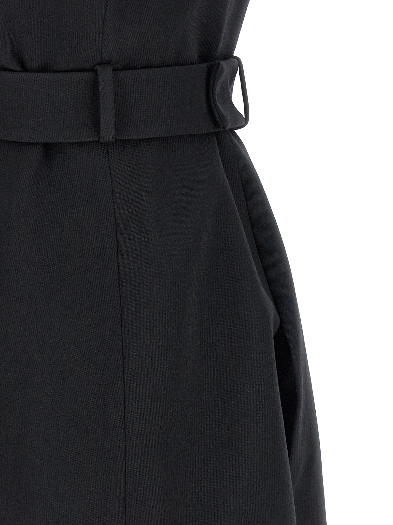 Wallet mini dress in grain de poudre with front button closure, V-neck, sleeveless, padded shoulder strap, pockets, lining, belt with removable metal 'Anthem' buckle. Belt