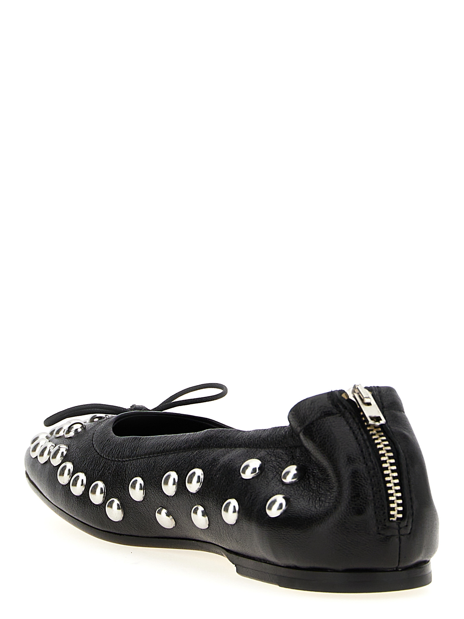 'Amy' nappa ballet flats with vintage treatment and all-over metal studs, front bow detail, square toe, back zip closure, leather sole.