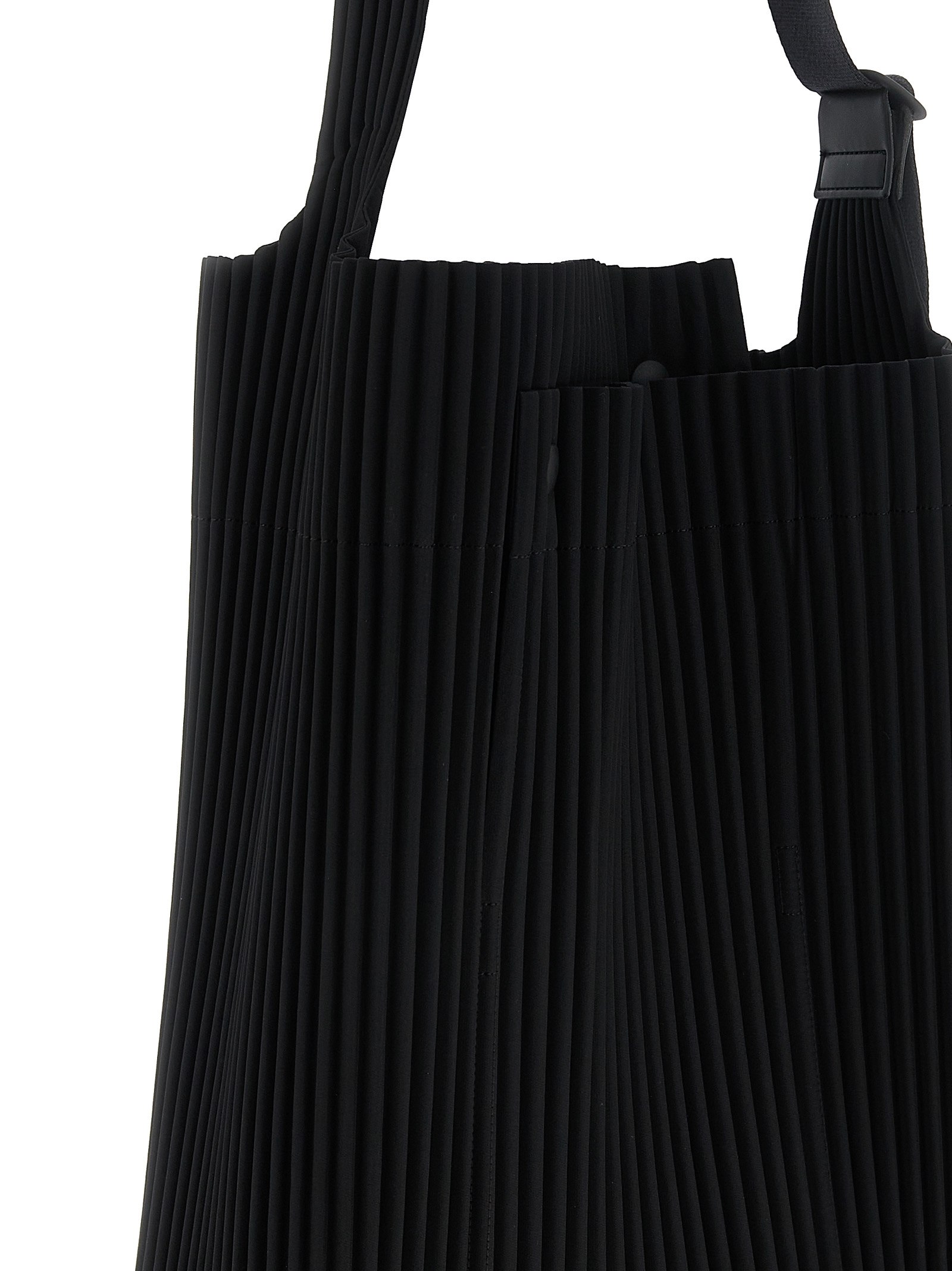 Utility medium shoulder bag in pleated fabric, adjustable handle, front and back pocket, and snap button closure.