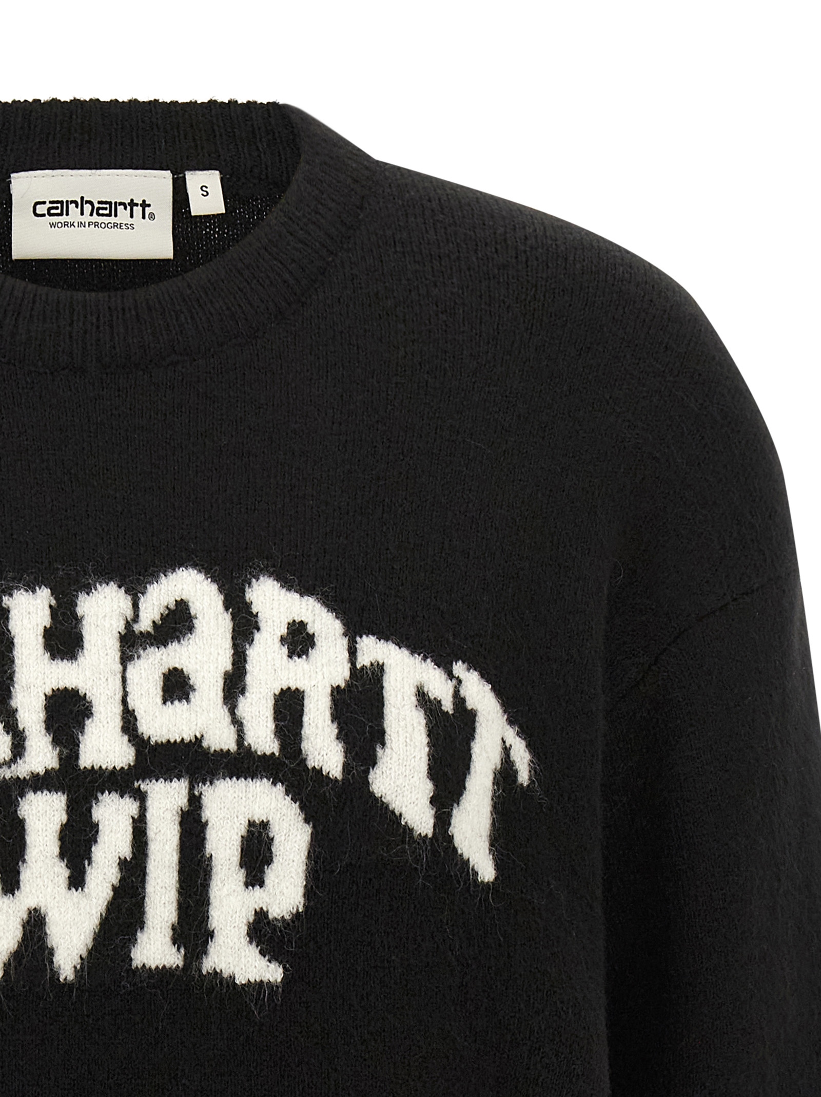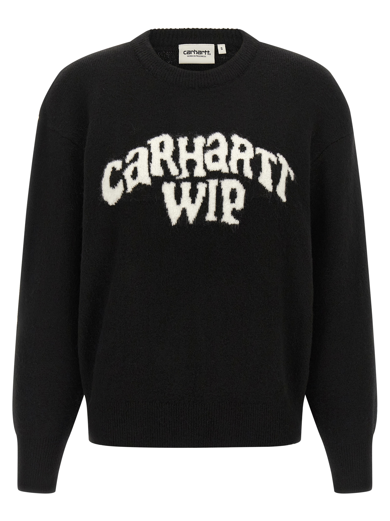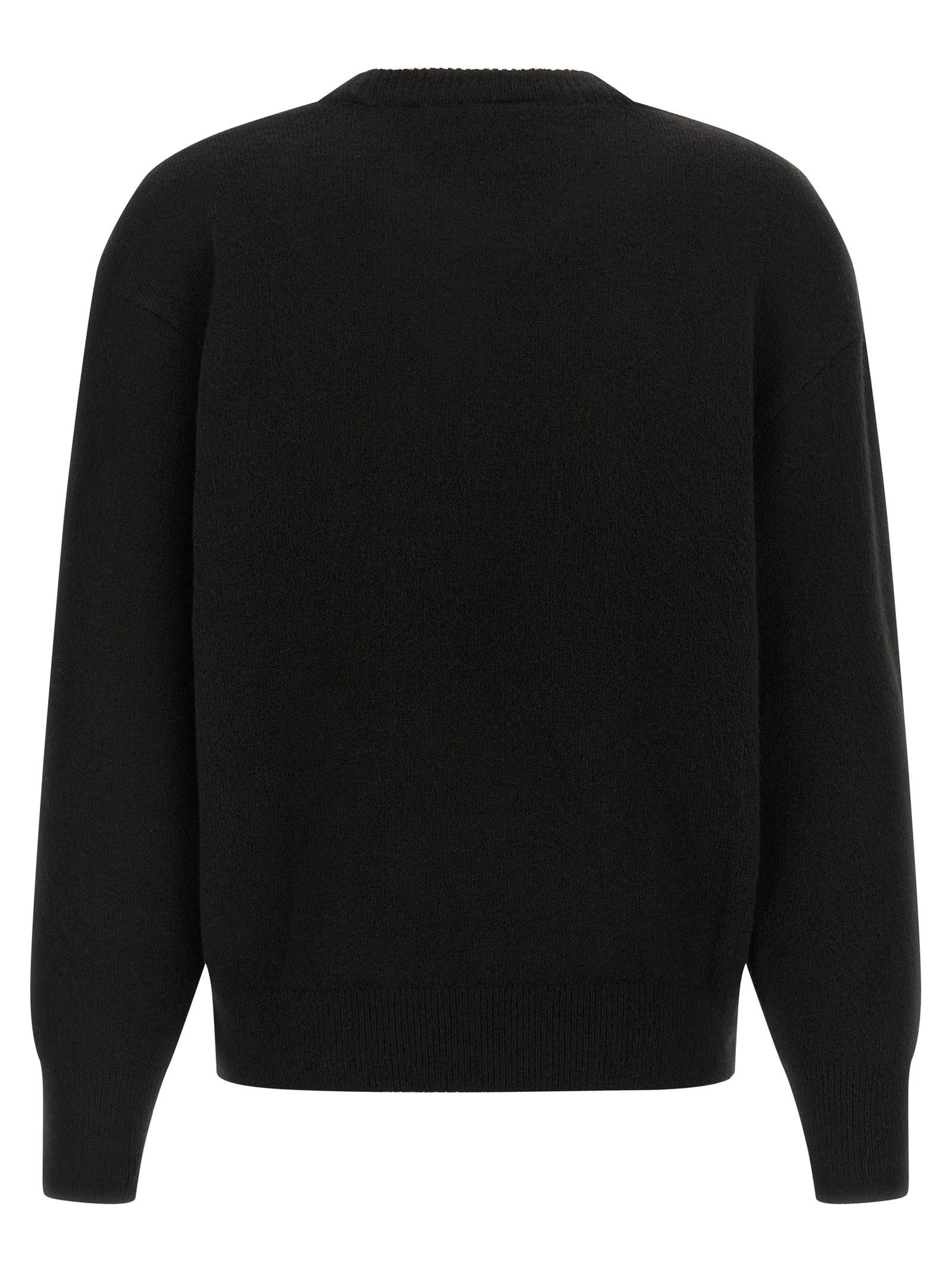 Wool crewneck sweater with front logo intarsia, long cuffed sleeves.