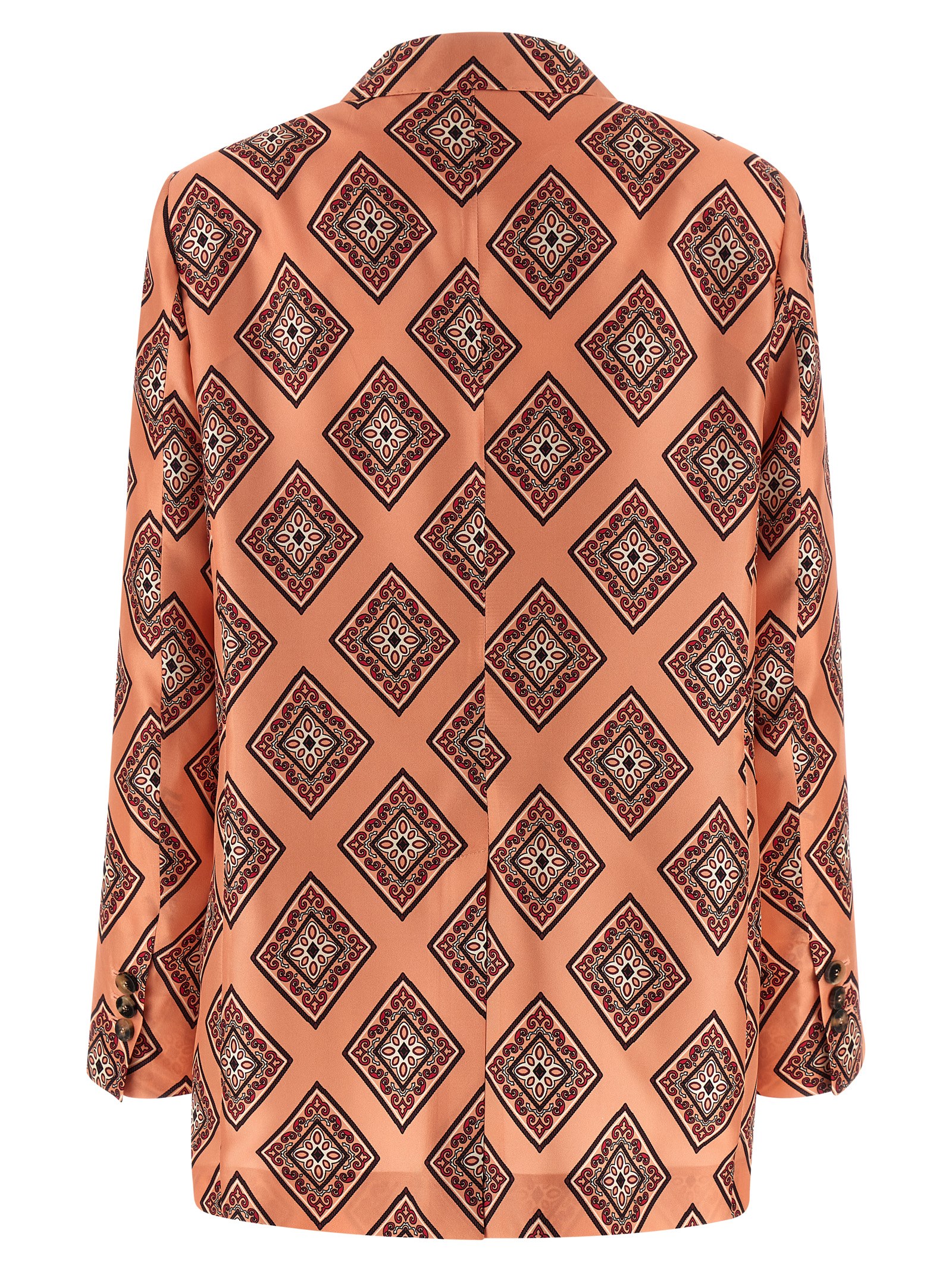 Single-breasted silk blazer with front horn button closure, mirror lapels, breast pocket, flap pockets, padded shoulder, long sleeves, back split, unlined.