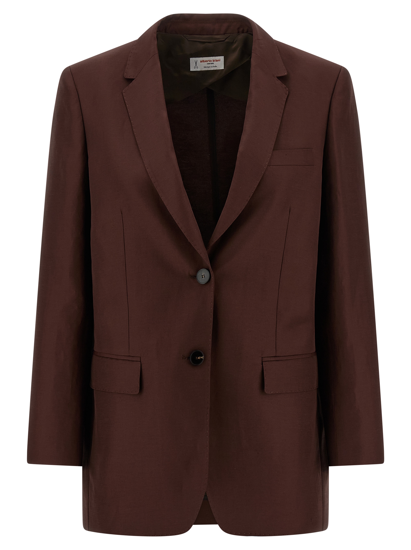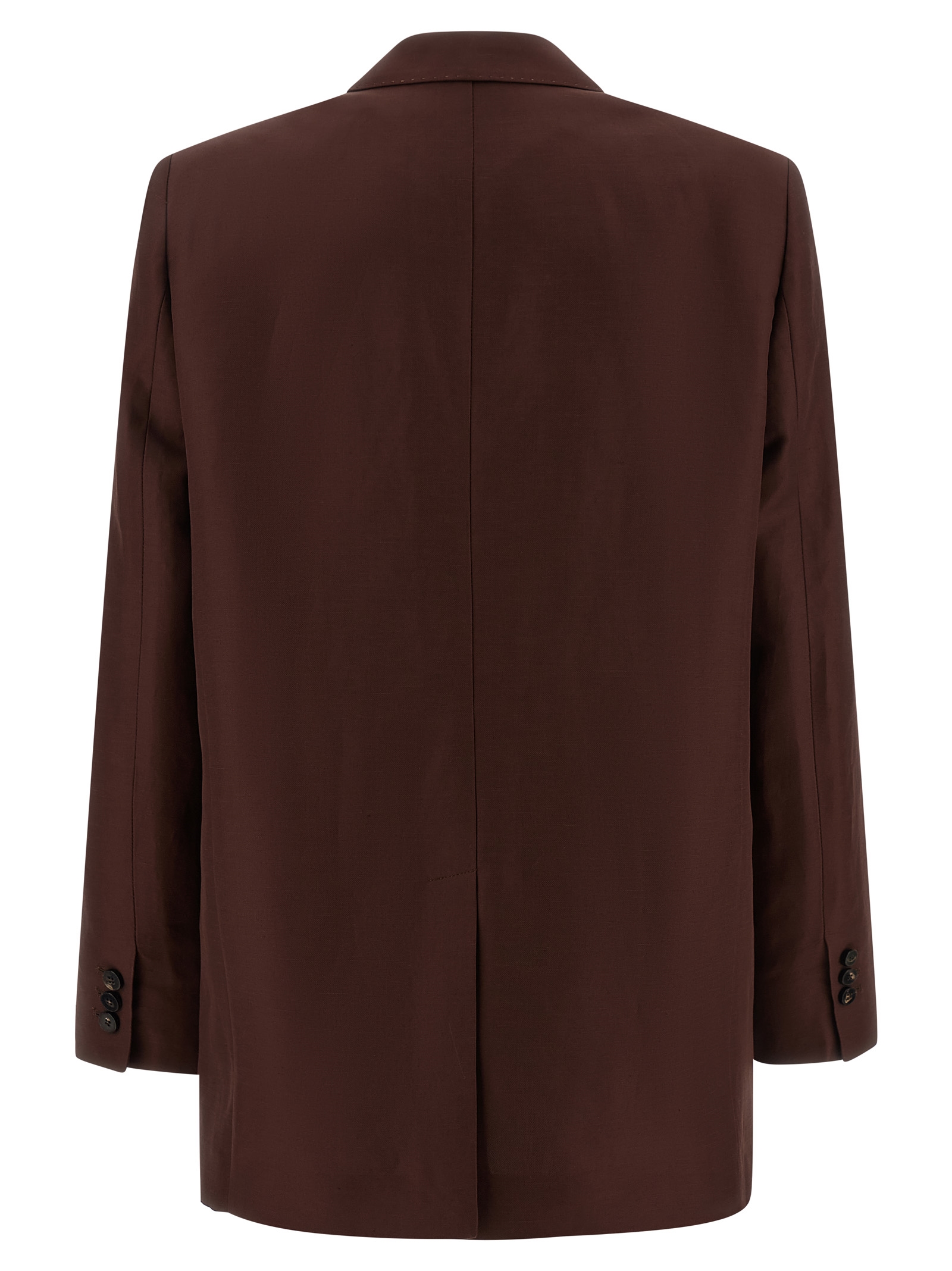 'America' single-breasted blazer in viscose and linen blend with front horn button closure, visible stitching, mirror lapels, breast pocket, flap pockets, structured shoulder strap, long sleeves, back split, unlined.
