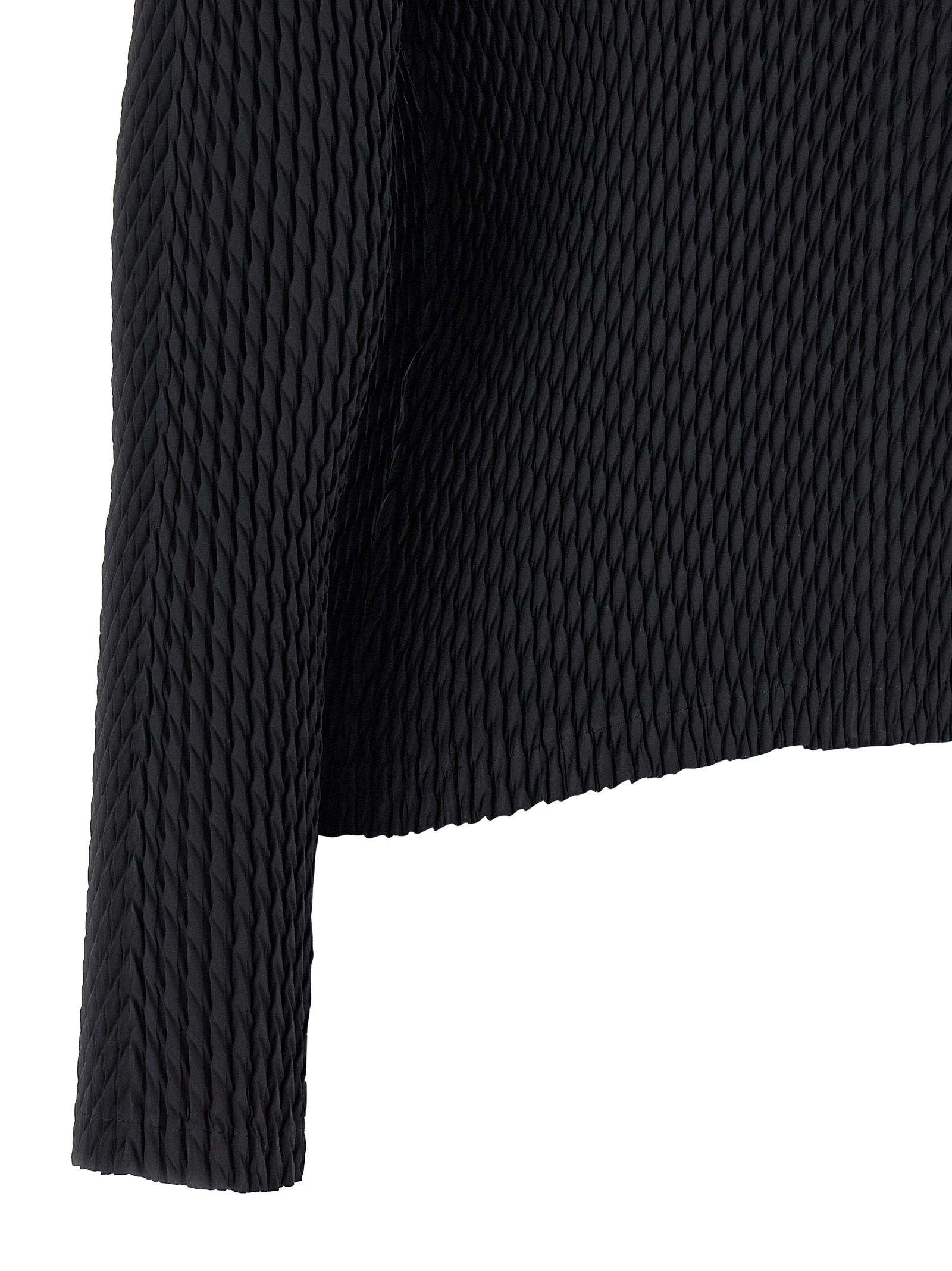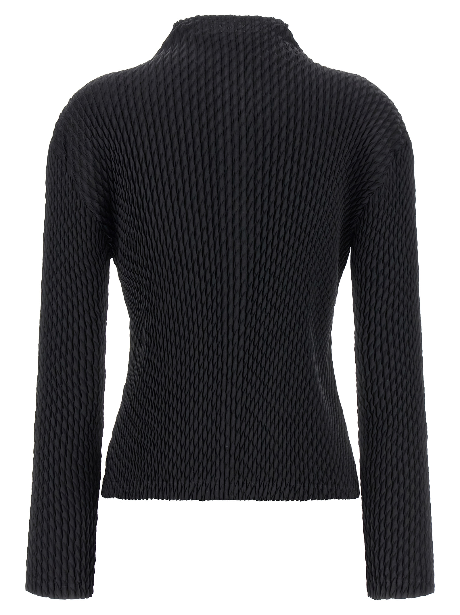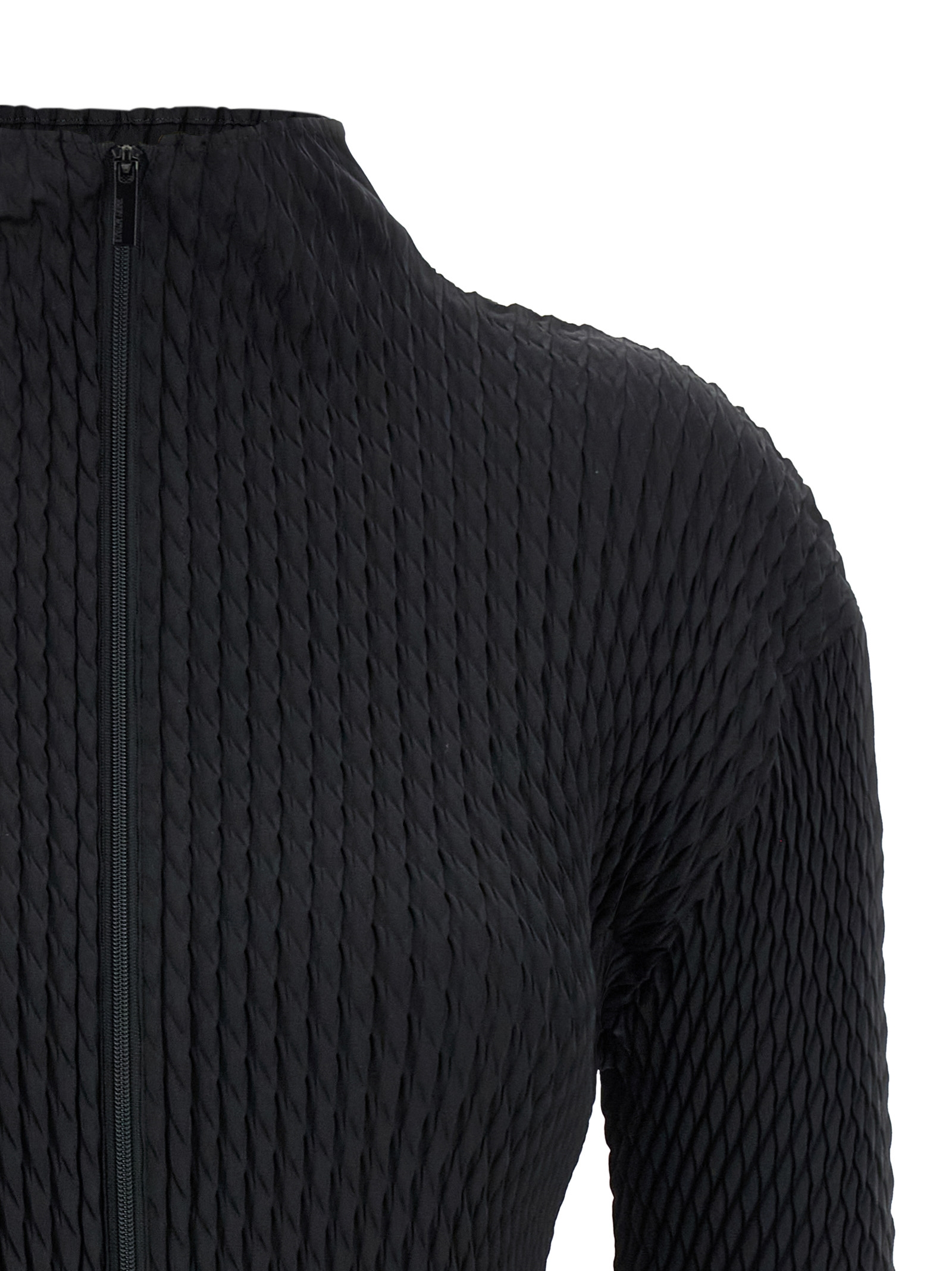 'Sleek Pleats' pleated cardigan with high neck, front zip closure.