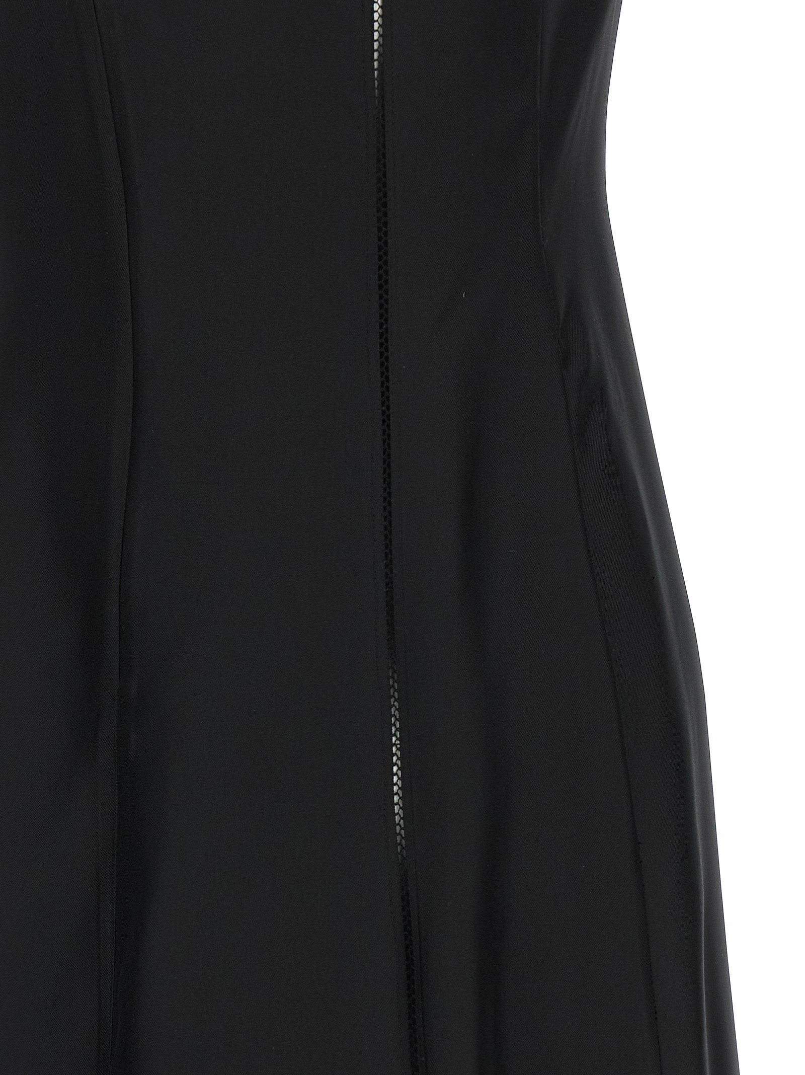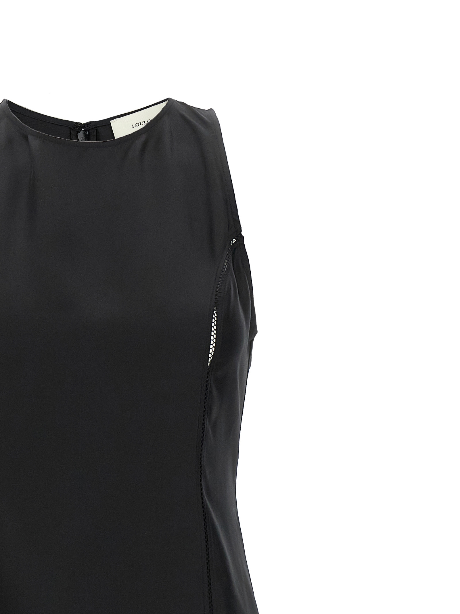 'Iraka' silk twill midi dress with lace stitch inserts, flared skirt with mesh tulle inserts, round neckline, sleeveless, back zip closure.
