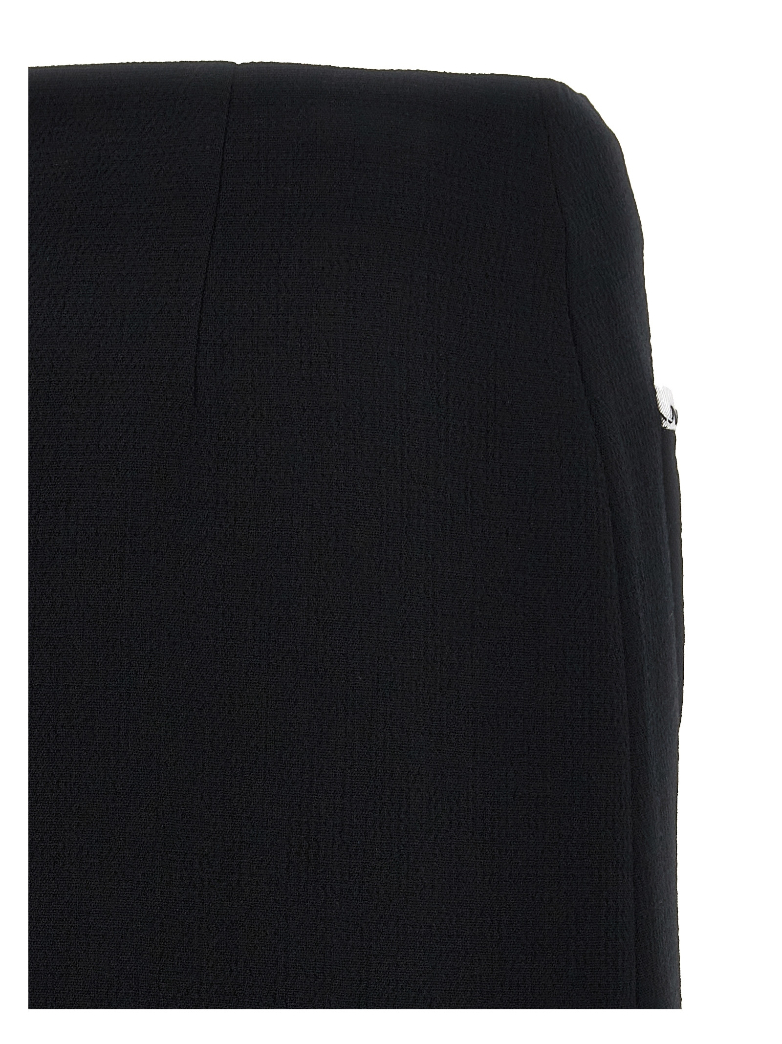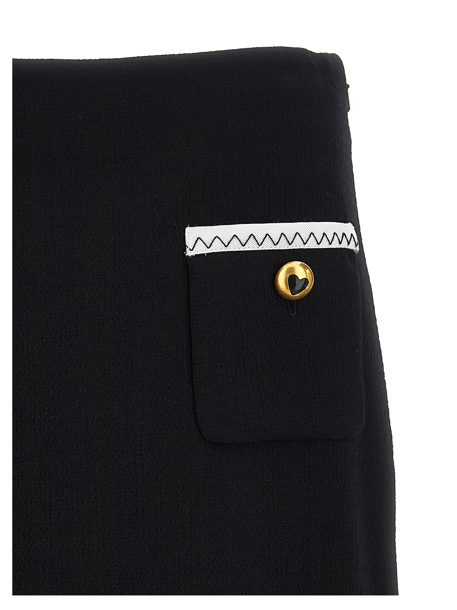 Viscose blend crepe skirt, front pockets with heart-shaped buttons, side zip closure, contrast grosgrain hem.
