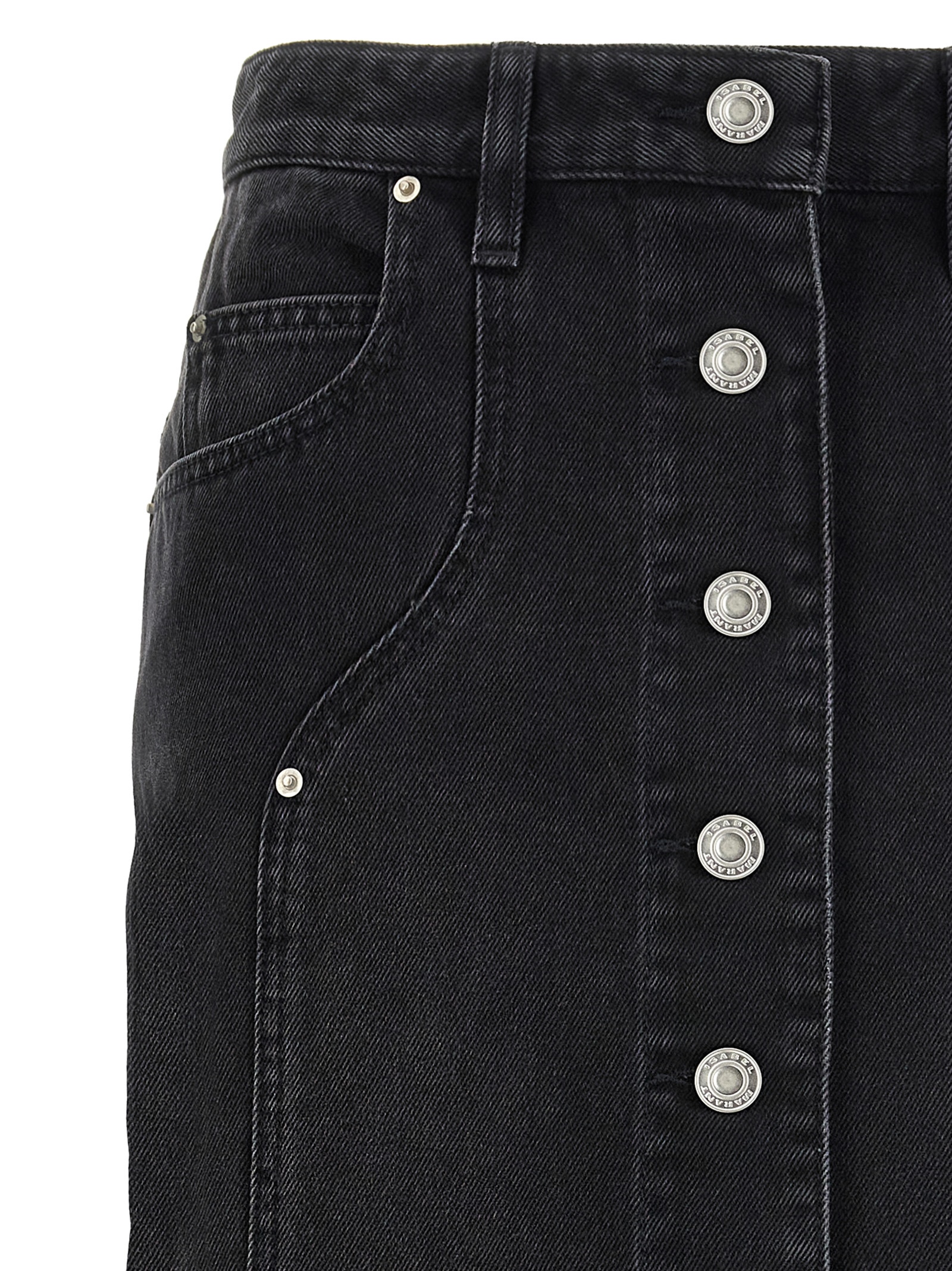 'Vandy' cotton denim skirt with front button closure, five pockets, leather logo tag.
