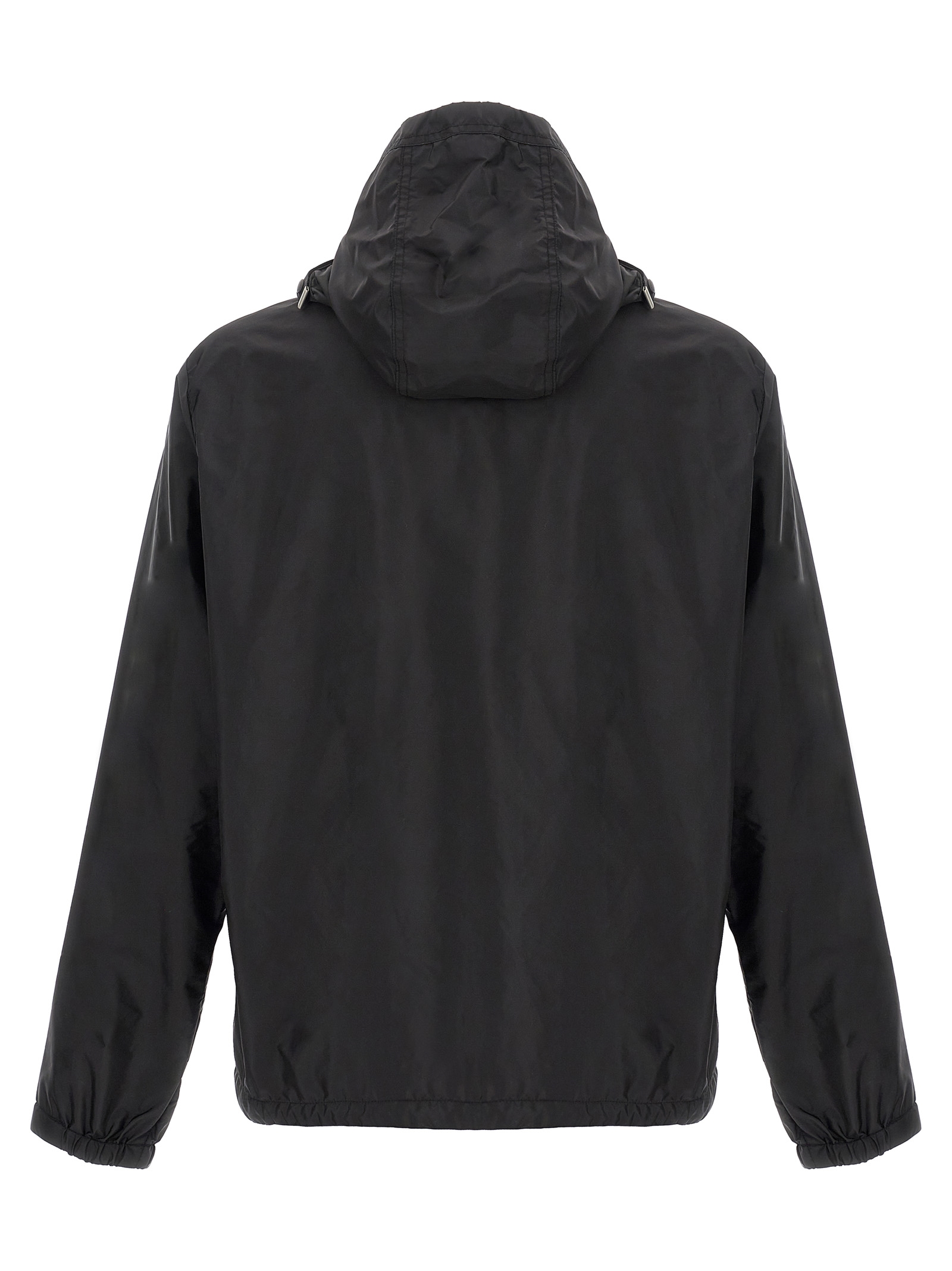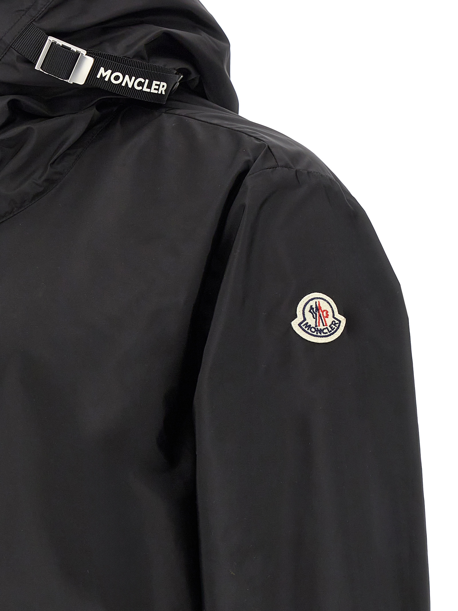 'Remoray' waterproof nylon waterproof, hood with adjustable side logo grosgrain straps, high neck, zip closure, pockets, long cuffed sleeves and felt logo patch.