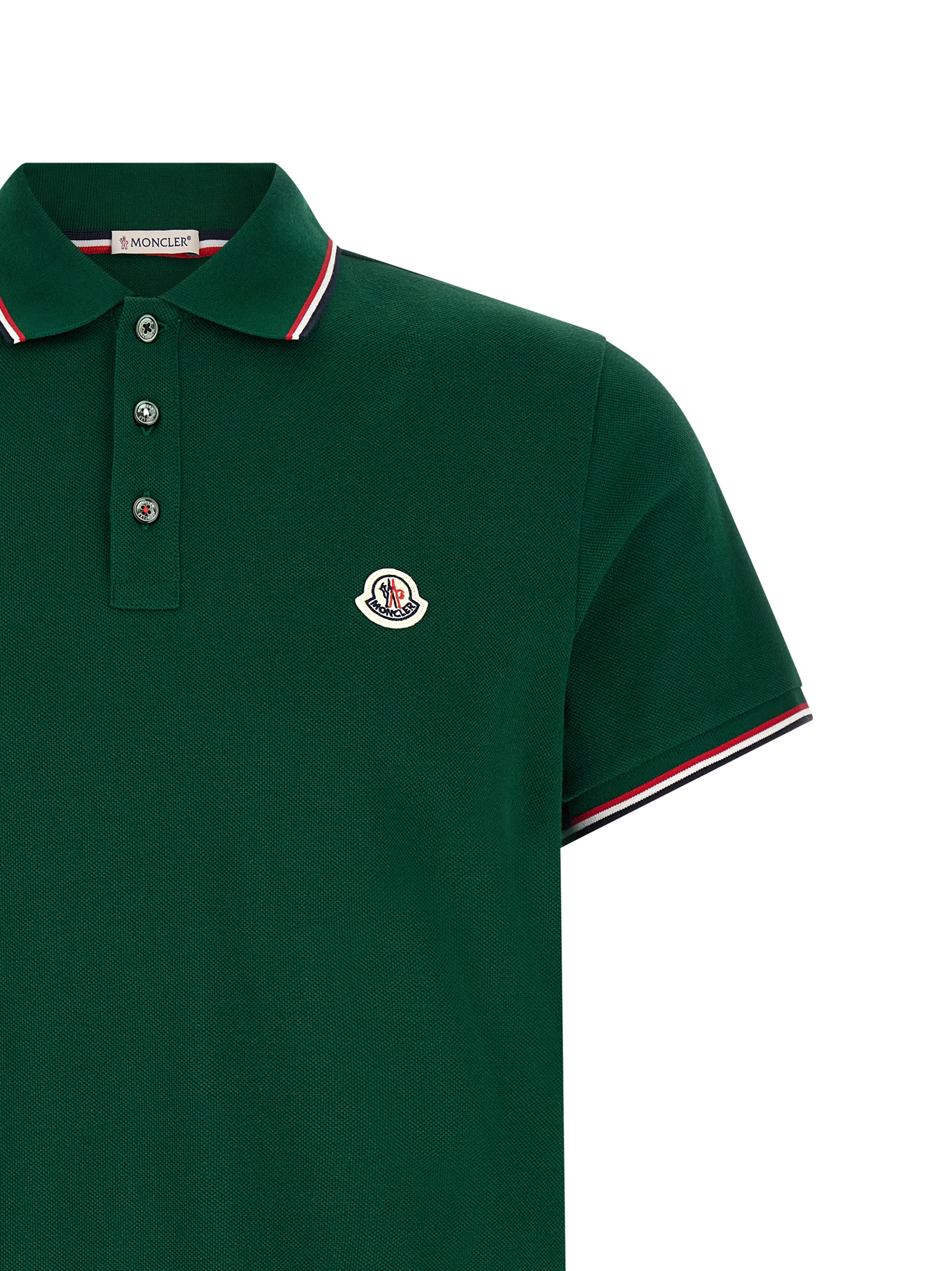 Cotton piquet polo shirt with tricolor details, front felt logo patch, collar and buttons, short cuffed sleeves, side slits.