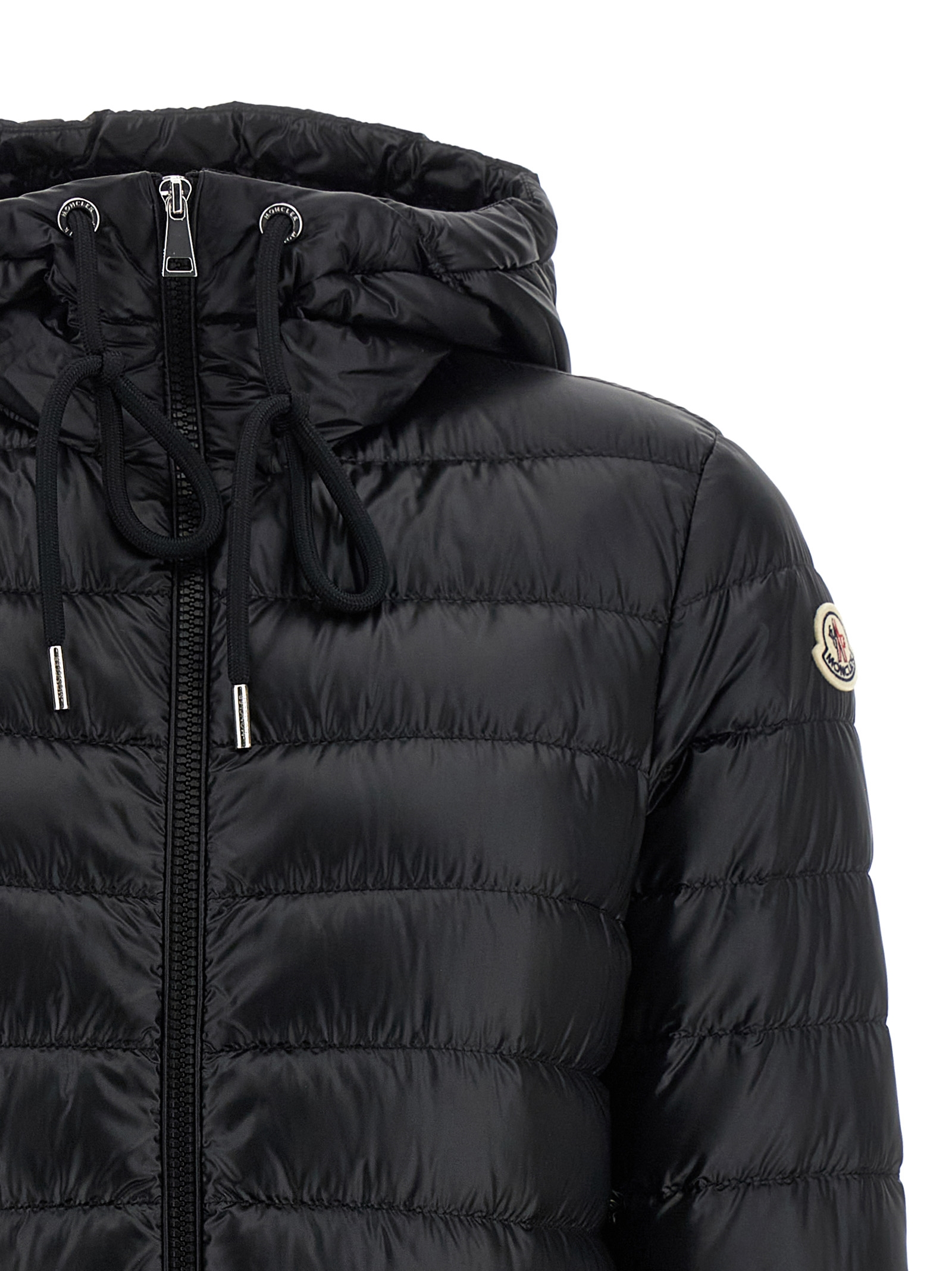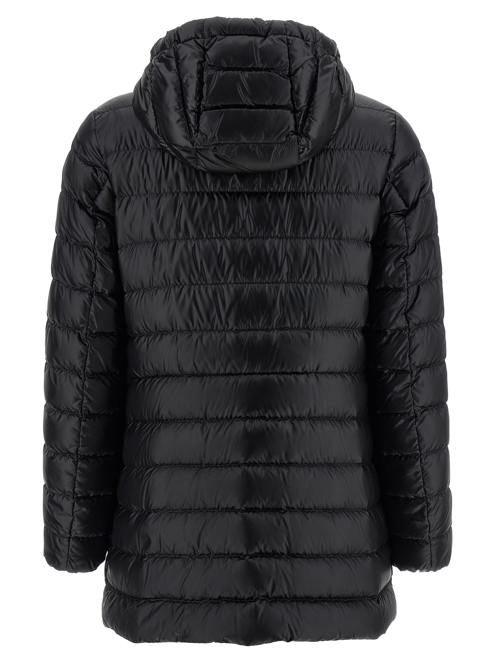 'Jasmin' water-repellent longue saison quilted down jacket with goose down padding, adjustable hood, high neck, front zip closure, tapered waist with drawstring, pockets, long sleeves with elastic cuffs and felt logo patch appliqué.