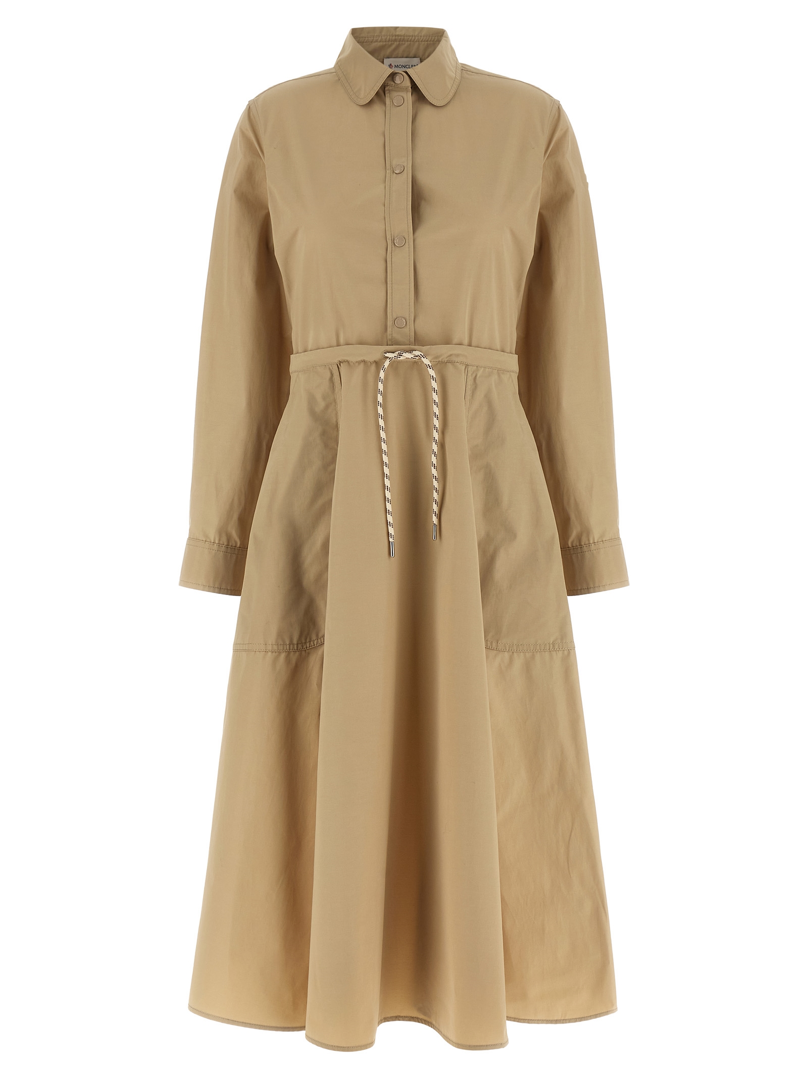Chemisier midi dress in technical poplin with hourglass silhouette with drawstring at the waist, front snap button closure, pockets, side zip closure, long cuffed sleeves and felt logo patch.