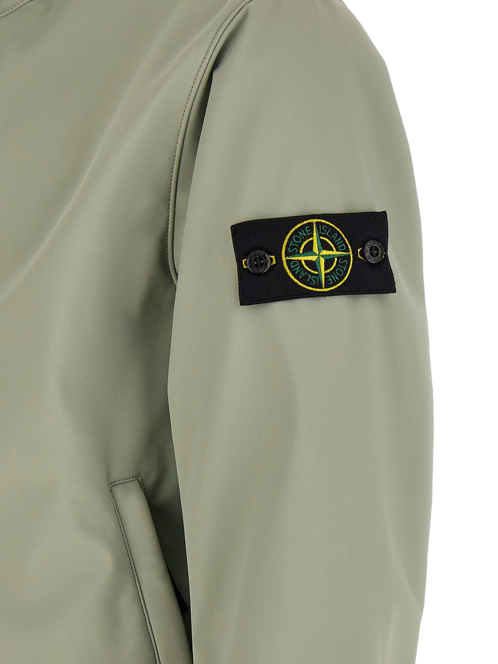 '4100118' jacket in three-layer technical material with 8000 mm water column with outer part in stretch polyester canvas woven with e.dye® Waterless Color System™ technology yarns and textured polyester jersey inner part with breathable and water and wind resistant membrane, adjustable hood, high neck, zip closure and front snap buttons, pockets, long sleeves with cuffs, logo badge appliqué, band on the hem.