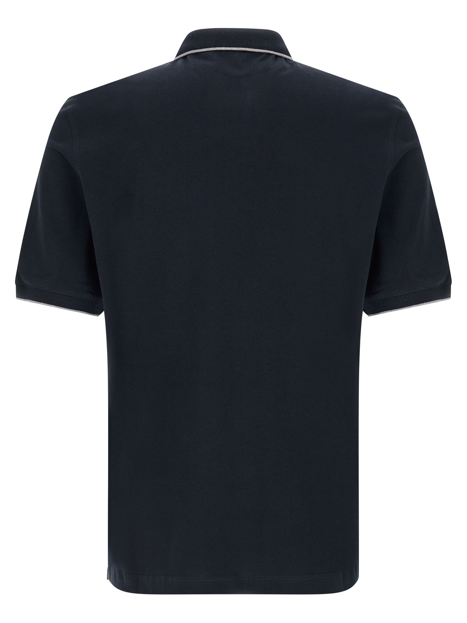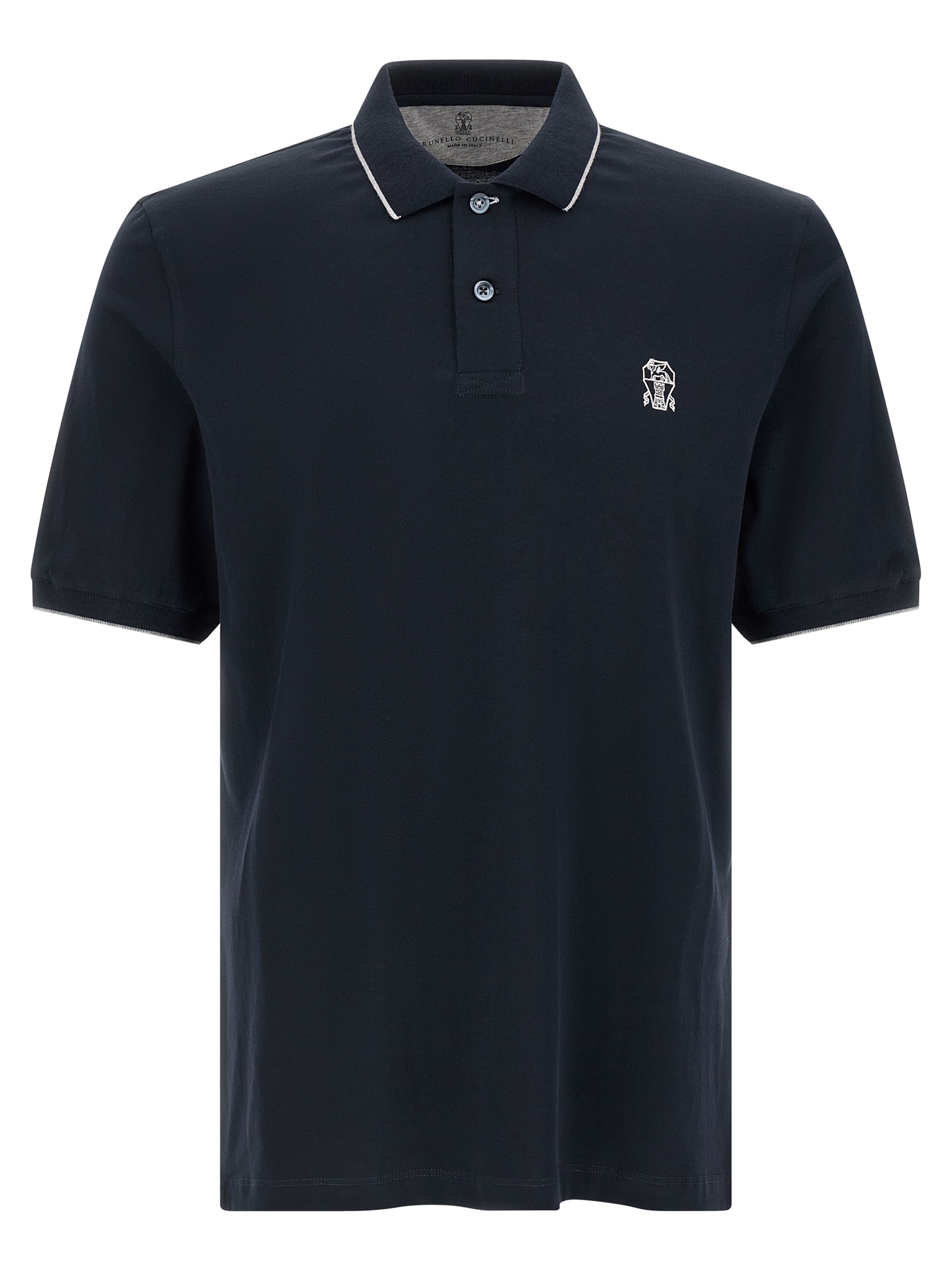 Mélange stretch cotton jersey polo shirt with ribbed knit collar and cuffs, embroidered coat of arms of Solomeo at the front, short sleeves with cuffs, side splits.