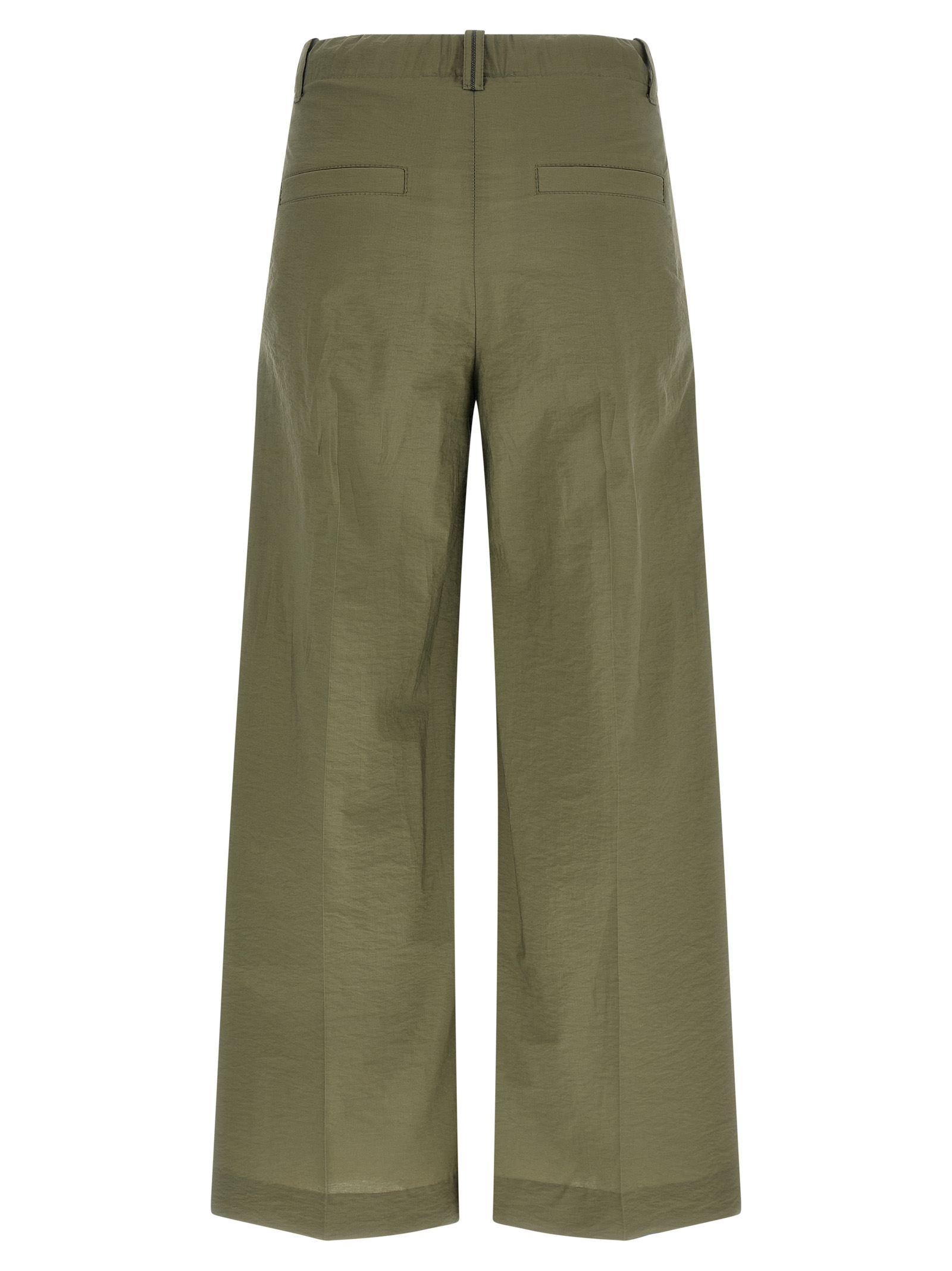 Cotton blend trousers, double pleats, wide leg, stretched pleat, front zip and button closure, pockets, back Monile detail.