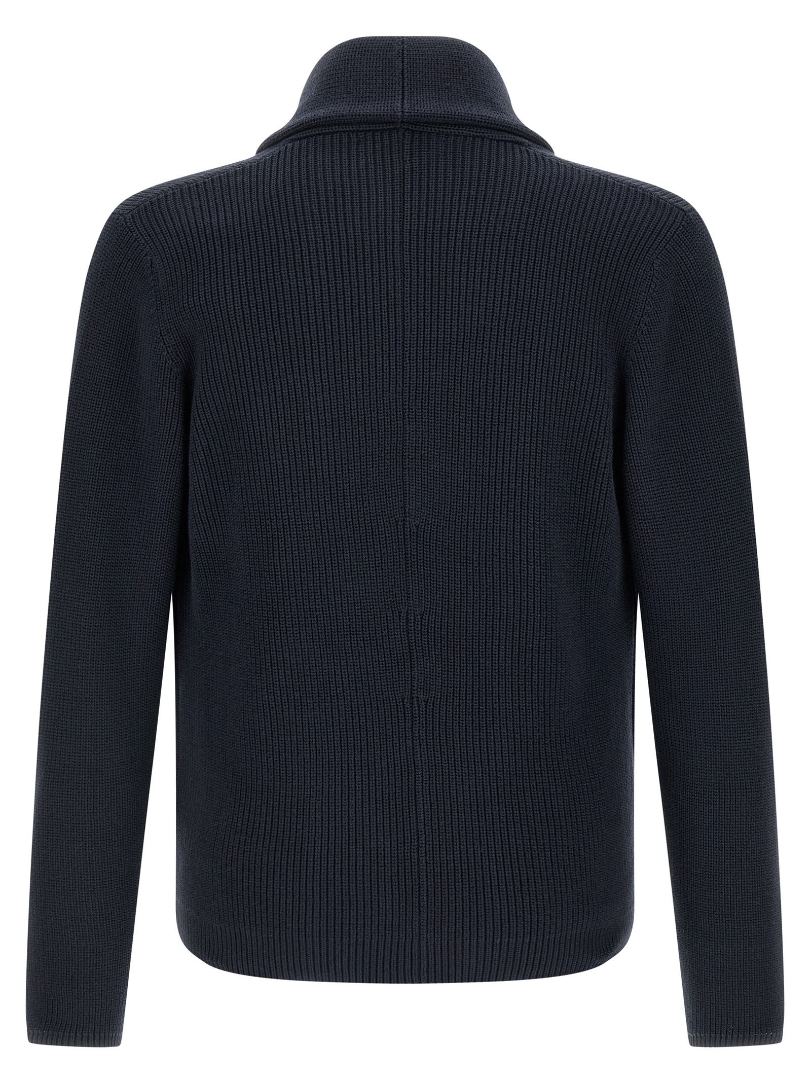 English half-ribbed cotton knit cardigan with metal buttons, double-breasted model, regular fit shoulder height and comfortable back, shawl neck, vertical pockets, long sleeves.