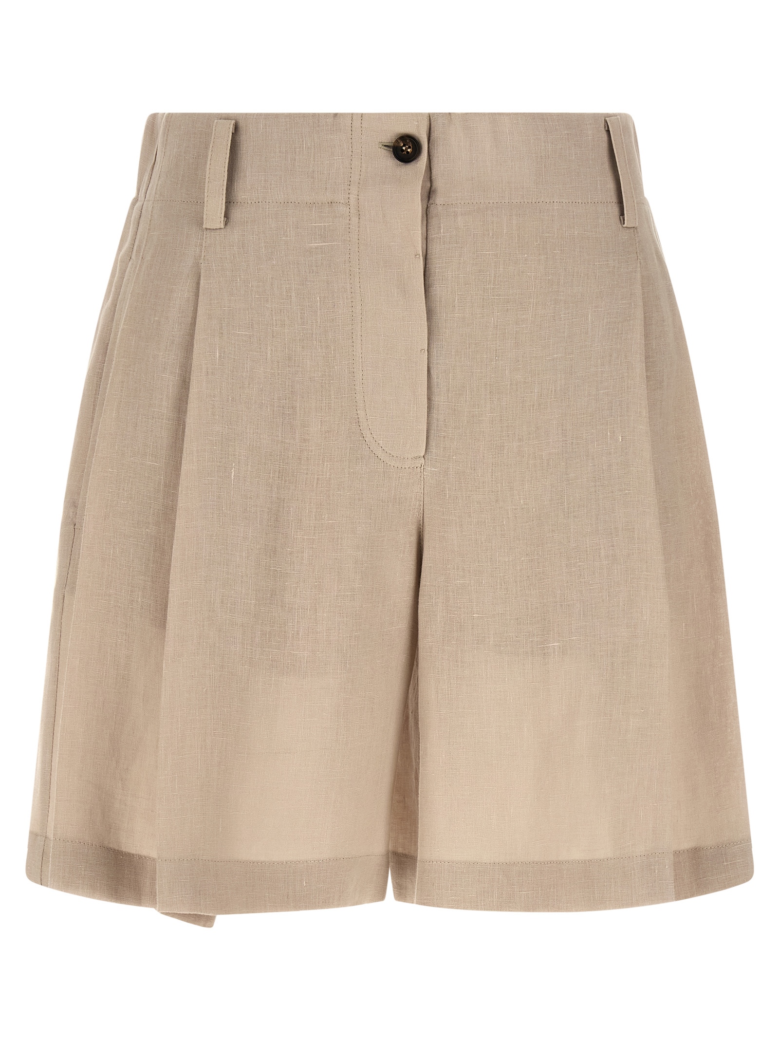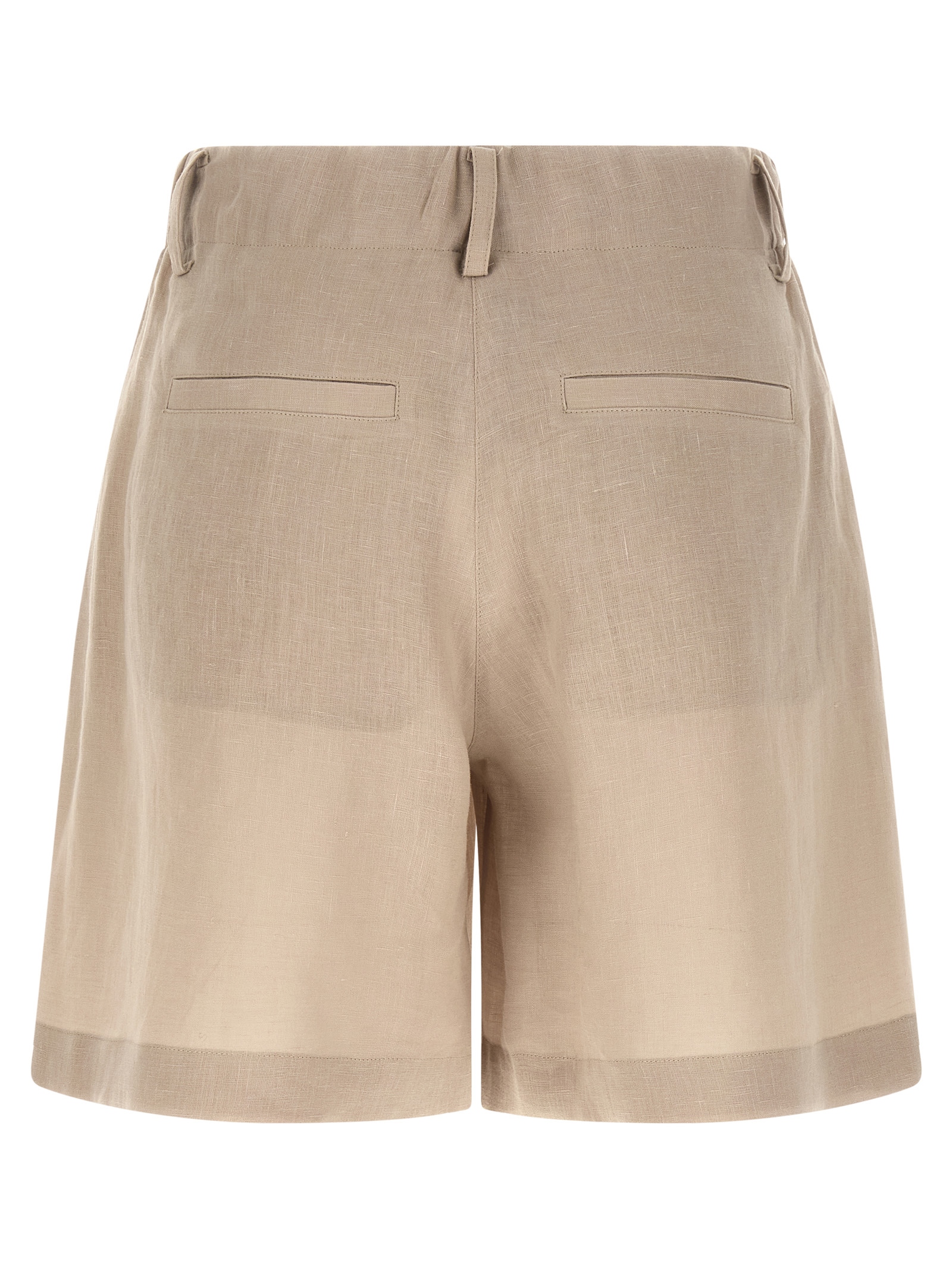 Linen shorts, double pleats and front button closure, pockets, elastic back waistband, wide leg.