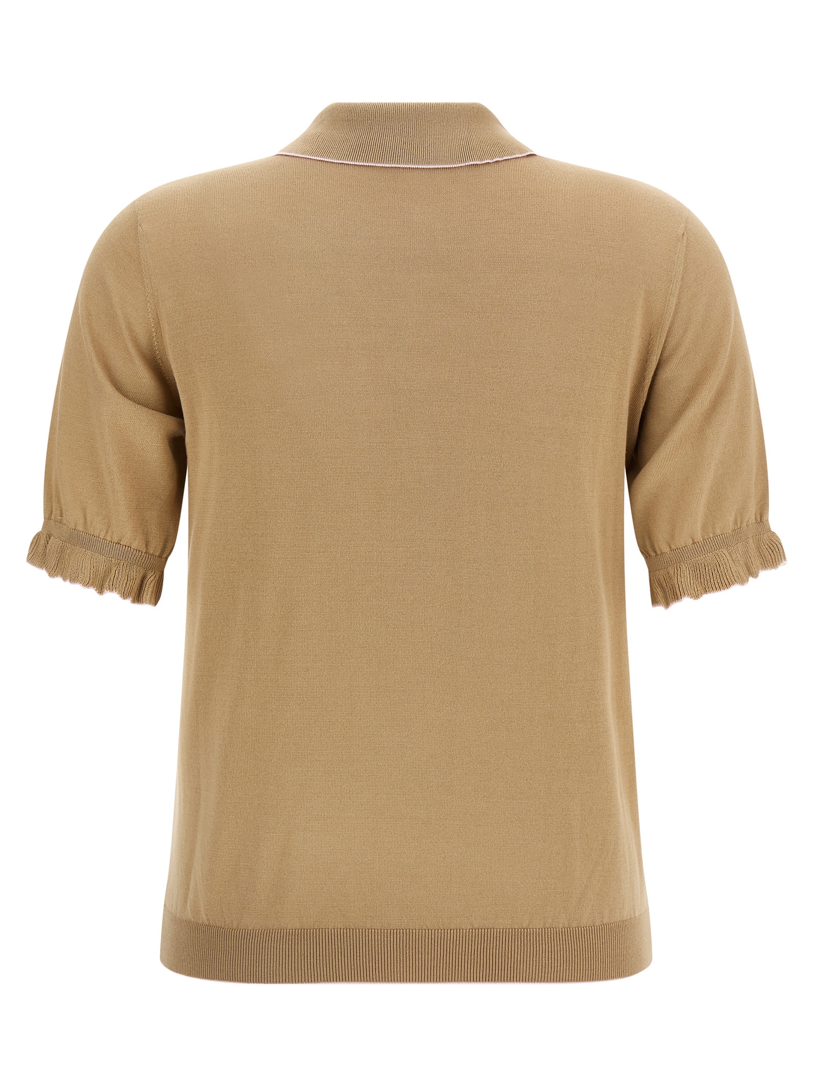 Polo shirt in stretch silk and cotton with contrasting piping, collar and buttons with tone-on-tone ruffle detail, short sleeves with cuffs and ruffles on the cuffs, and band on the hem.