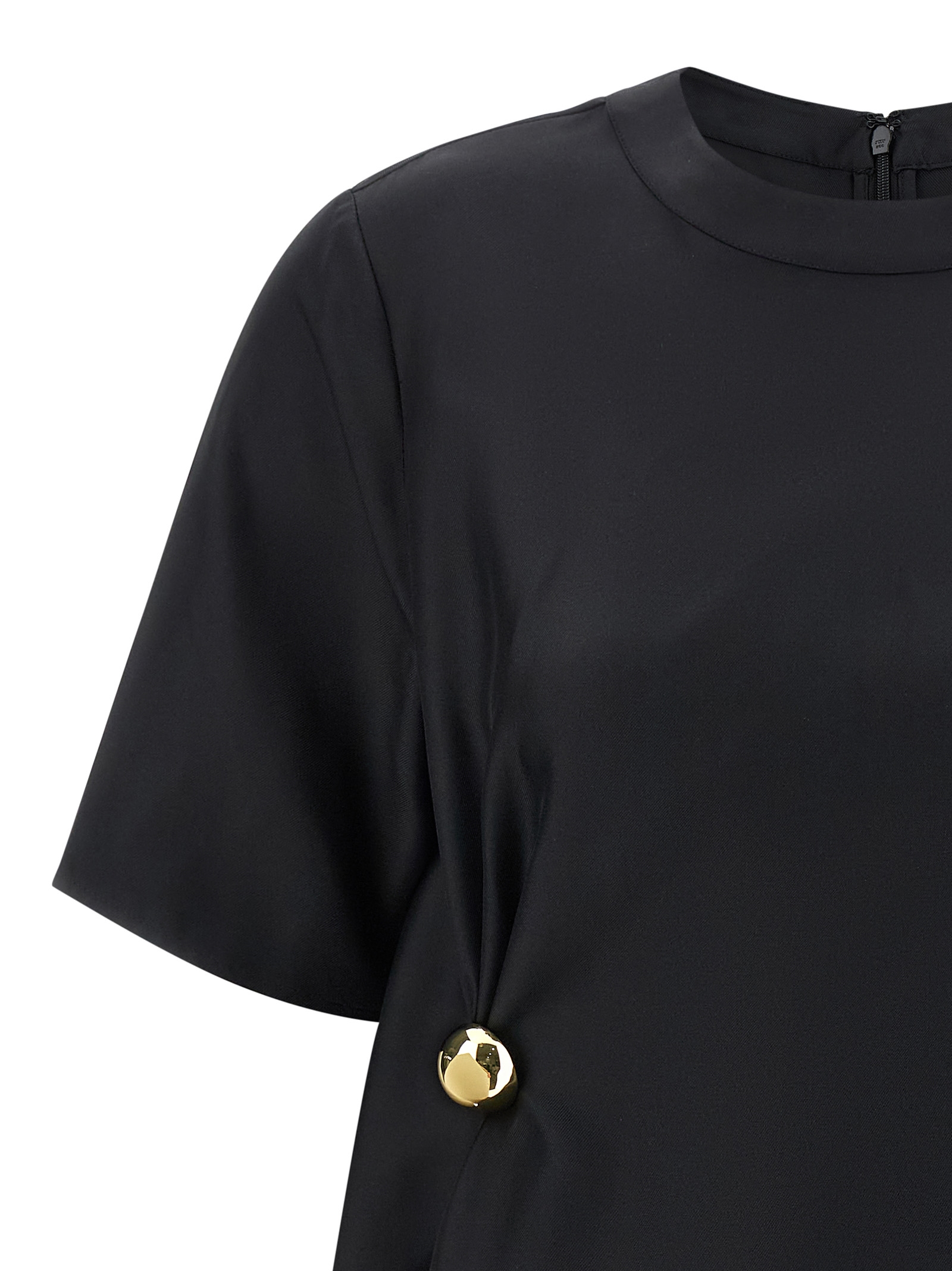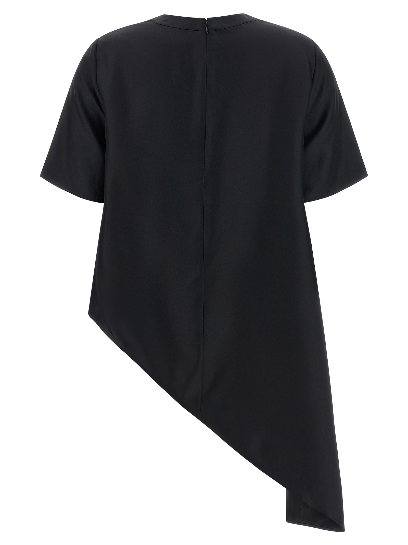 'Madea' silk twill top with trapezoid silhouette, side draping thanks to metal detail, crew neck, back zip closure, short sleeves, asymmetrical hem.