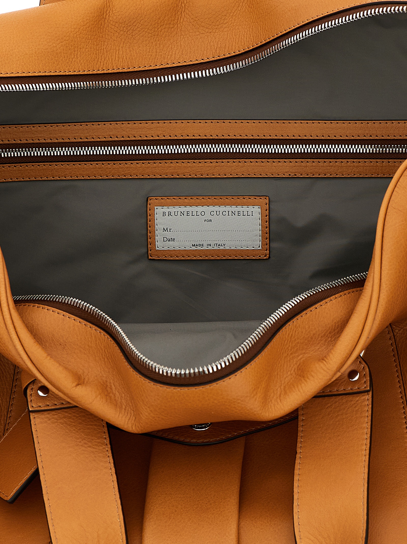 'Travel' cowhide leather duffel bag, water-repellent fabric lining, front embossed logo, double fixed handle, top zip closure, front and back pockets, rigid bottom with metal feet, adjustable and removable shoulder strap with padded shoulder strap, removable nameplate.