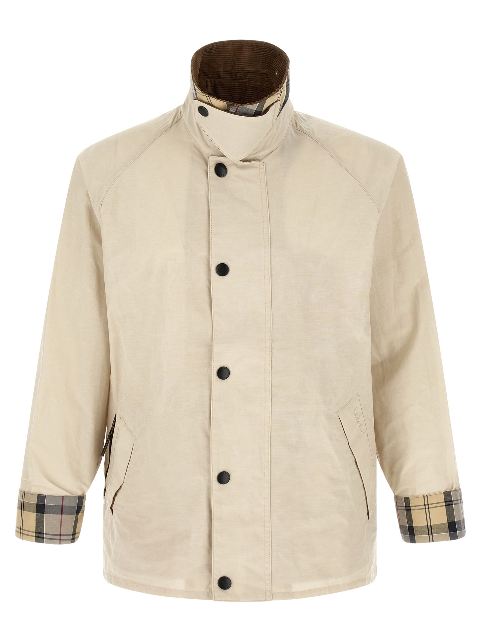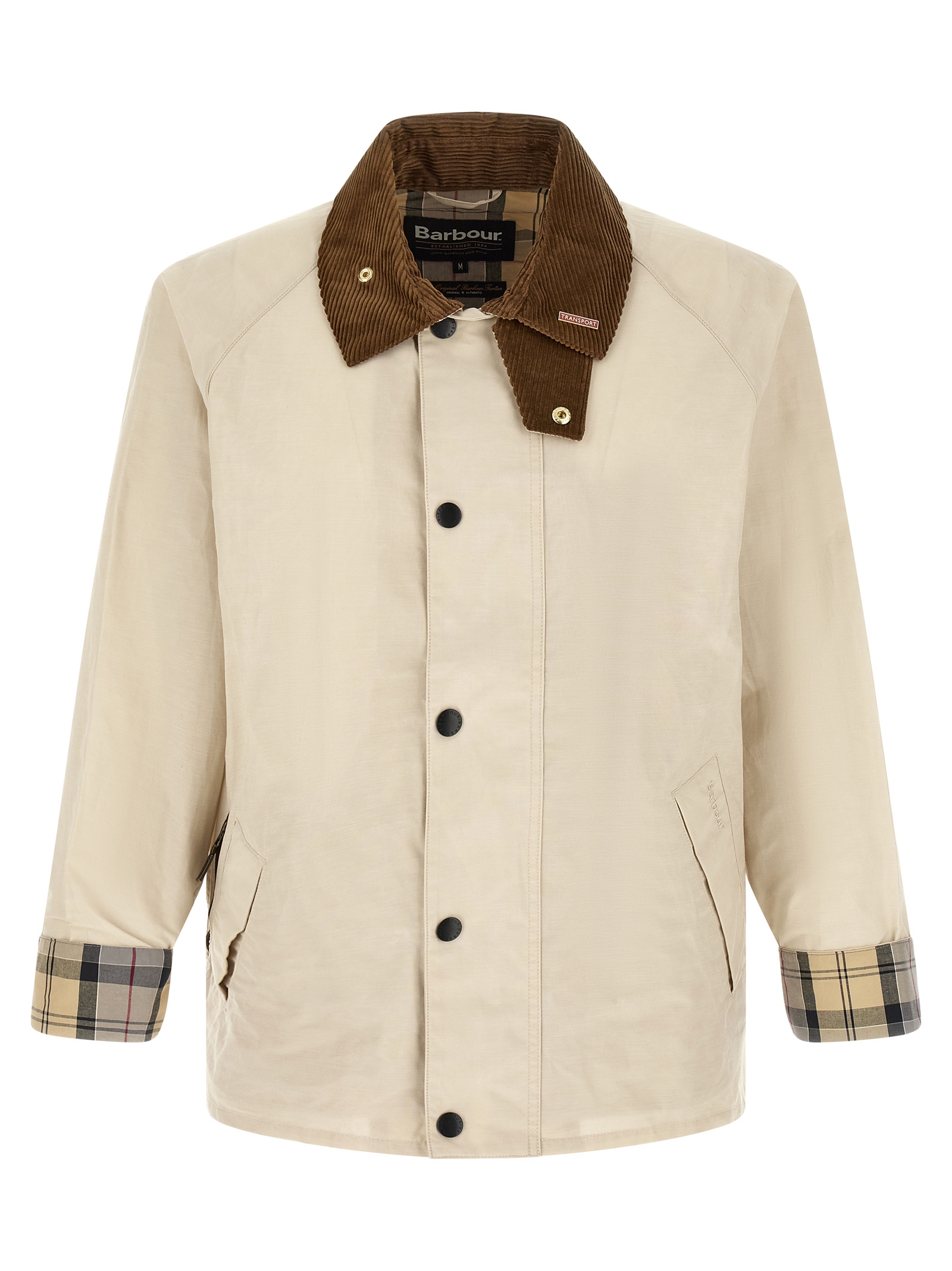 'Transporter Icons' cotton blend jacket with contrast corduroy shirt collar with chinstrap, removable metal brooch and tartan under collar, tone-on-tone logo embroidery and front zip and snap button closure, pockets, long raglan sleeves with foldable cuffs, tone-on-tone logo patch on the back, tartan half lining.
