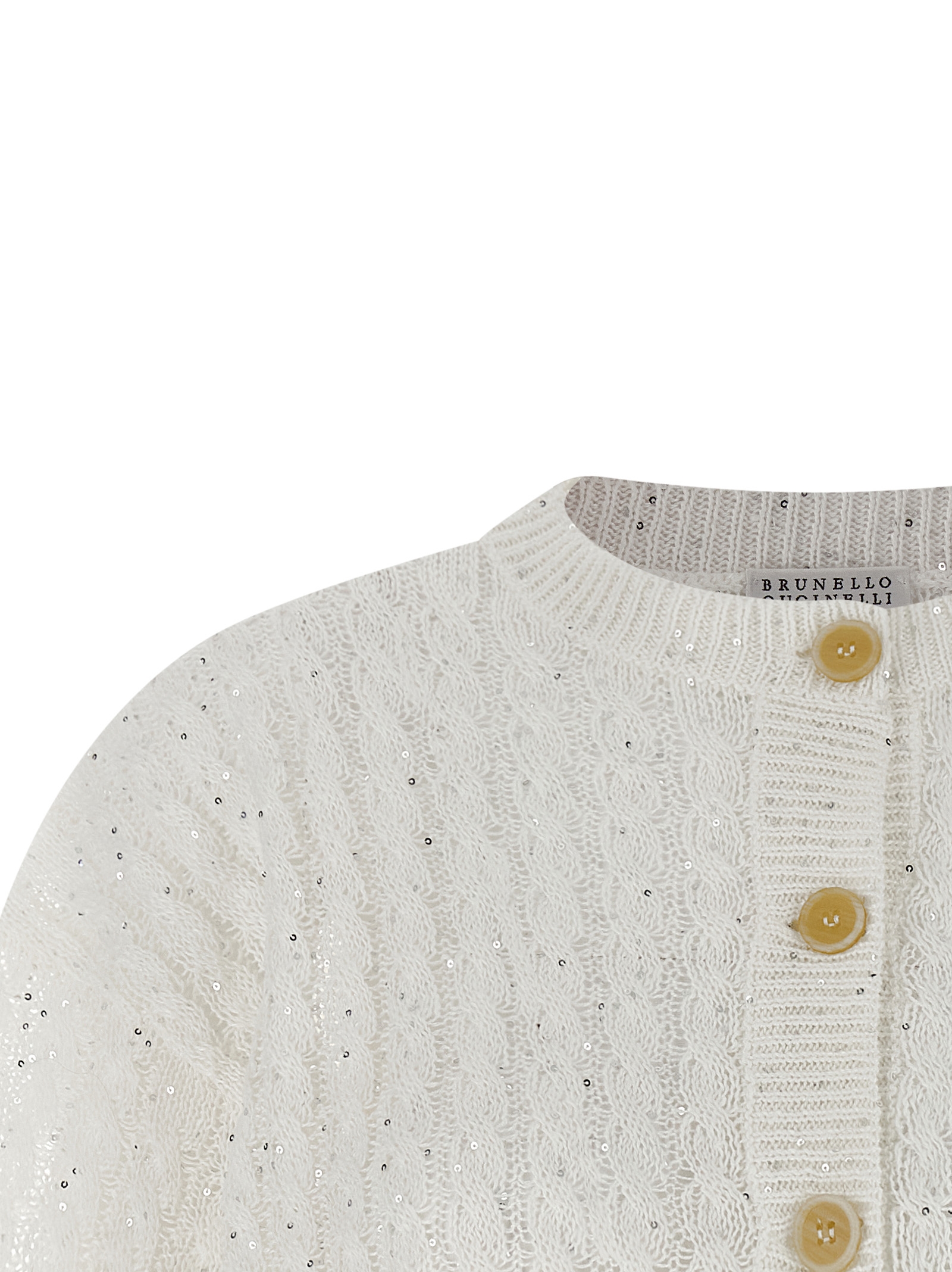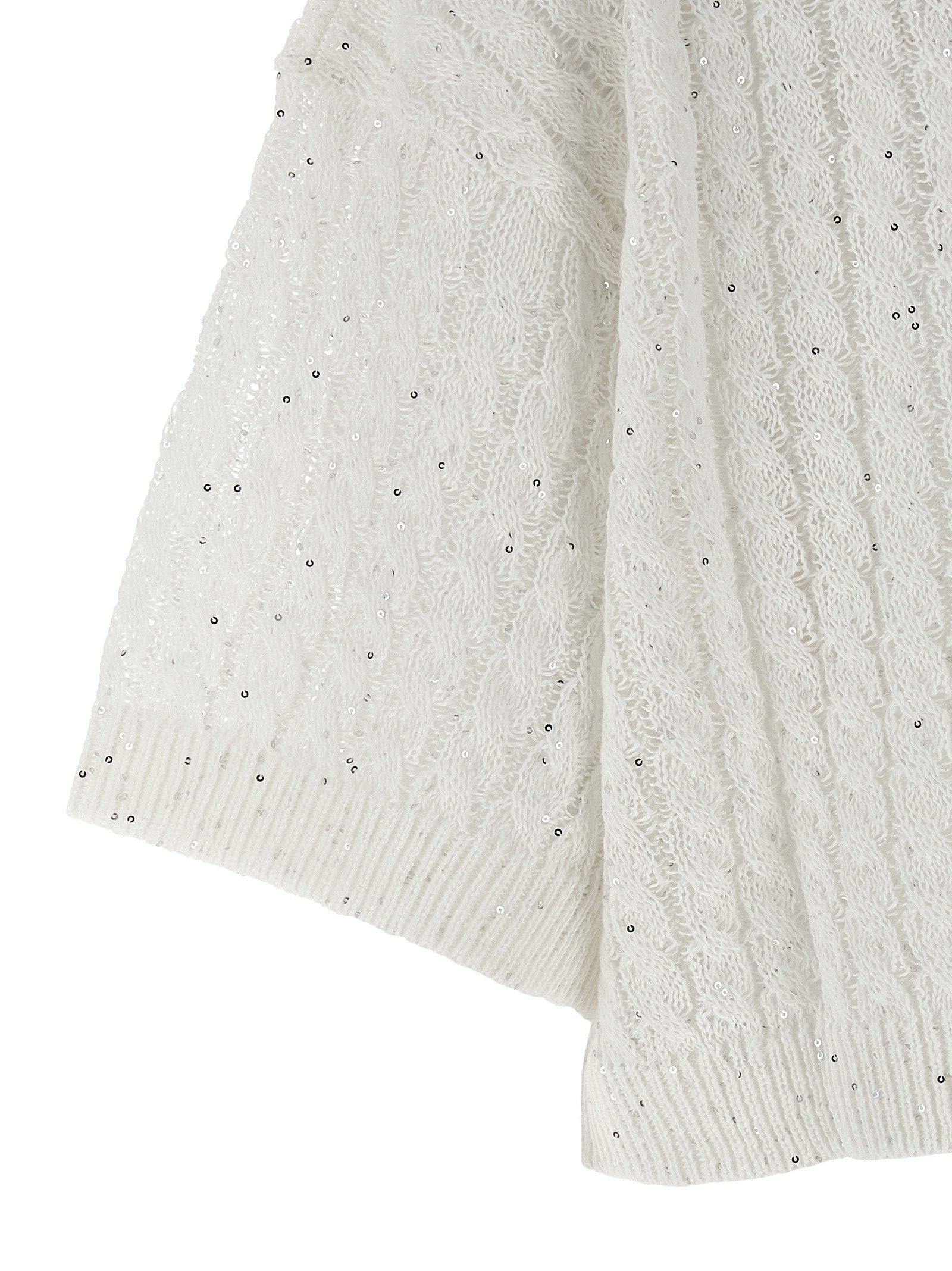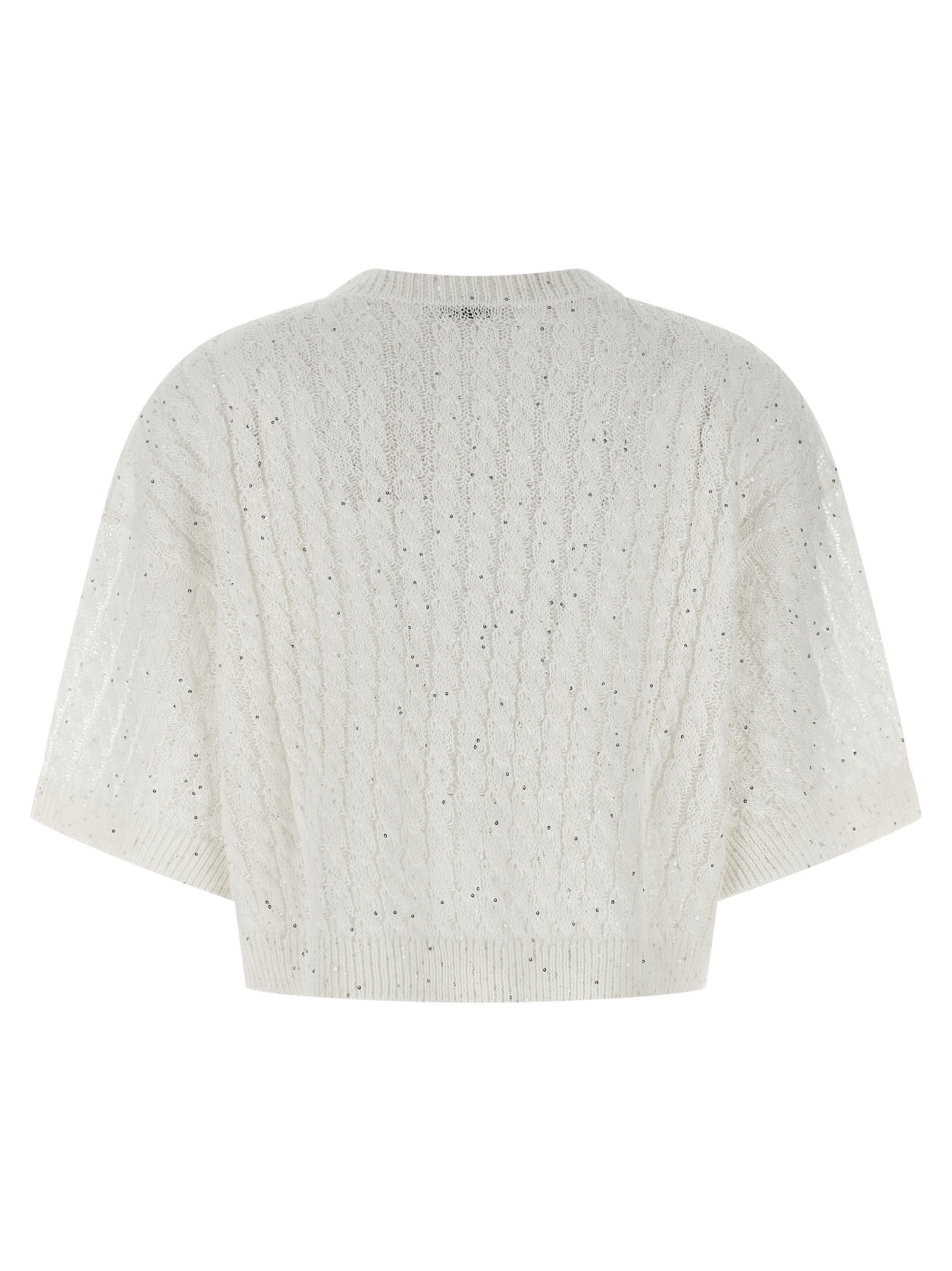 'Dazzling Cable' openwork ribbed linen cardigan with braided pattern and all-over sequin application, crop model, crew neck, short sleeves with cuffs and dropped shoulder.
